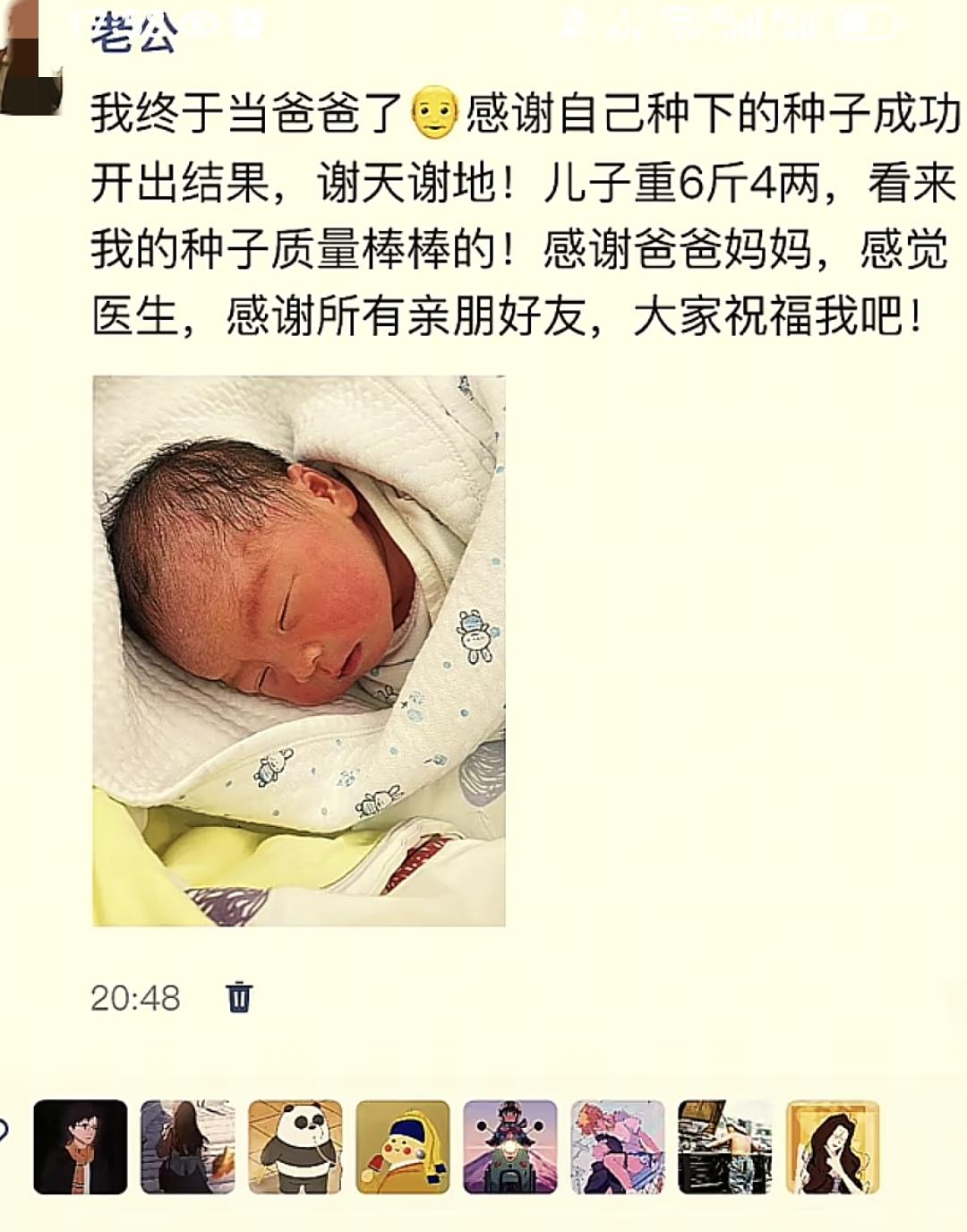 “我終於當爸爸了!感謝自己種下的種子成功開花結果。謝天謝地,兒子重約6斤4兩,看來我的種子質量棒棒的!感謝爸媽的養育,感謝醫生的幫忙,感謝各位親人的祝福。”