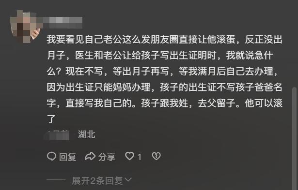 湖北網友更直接:“我要看到自己老公發這種朋友圈,直接叫他滾蛋。到時候辦出生證明,只寫媽媽的名字,去父留子!”