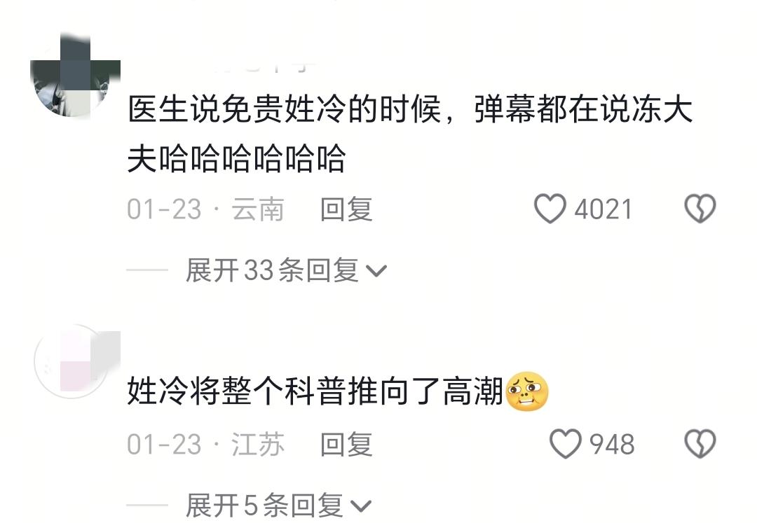 彈幕瞬間被“凍大夫”刷屏,本來嚴肅的科普,因這個充滿“冰點”的姓氏,瞬間讓網友破防,直呼“這姓太應景了!”