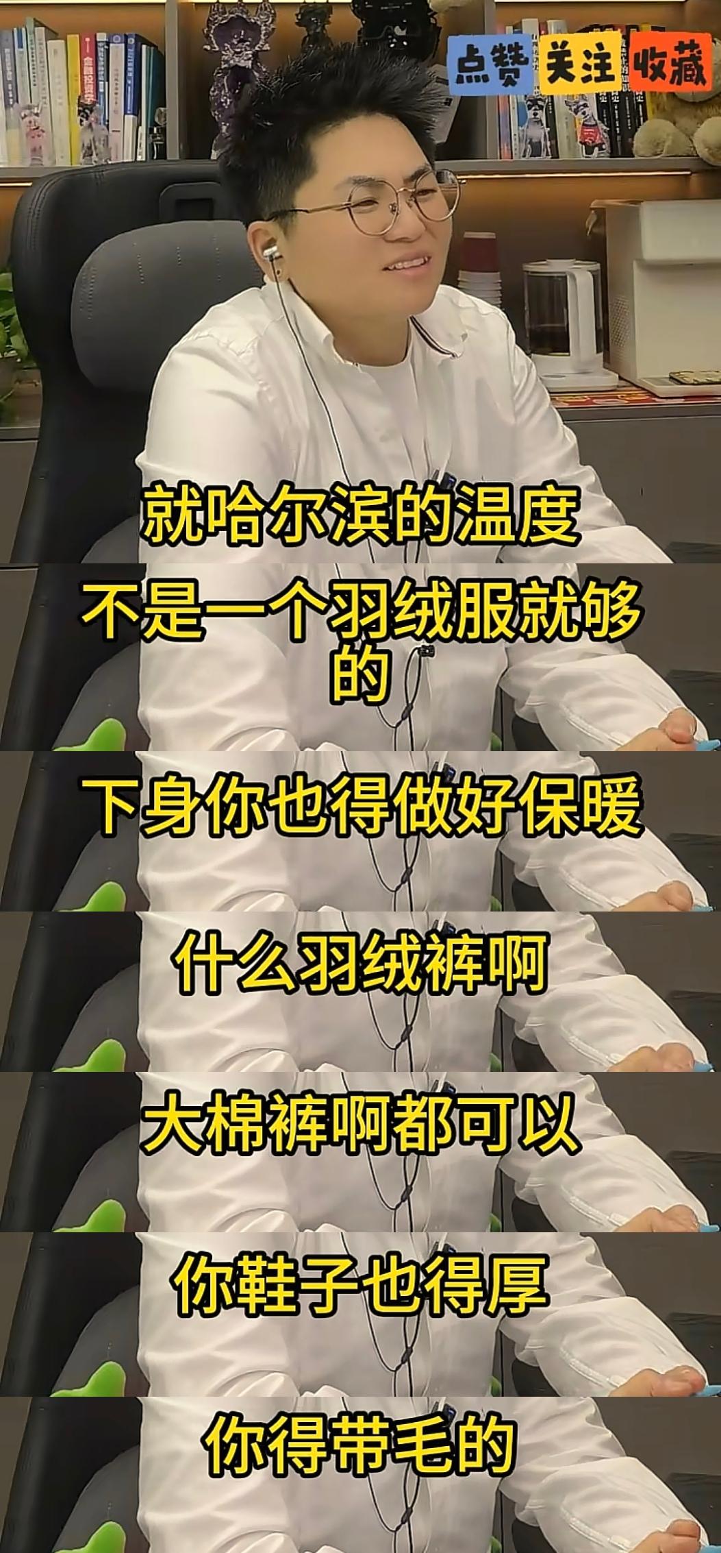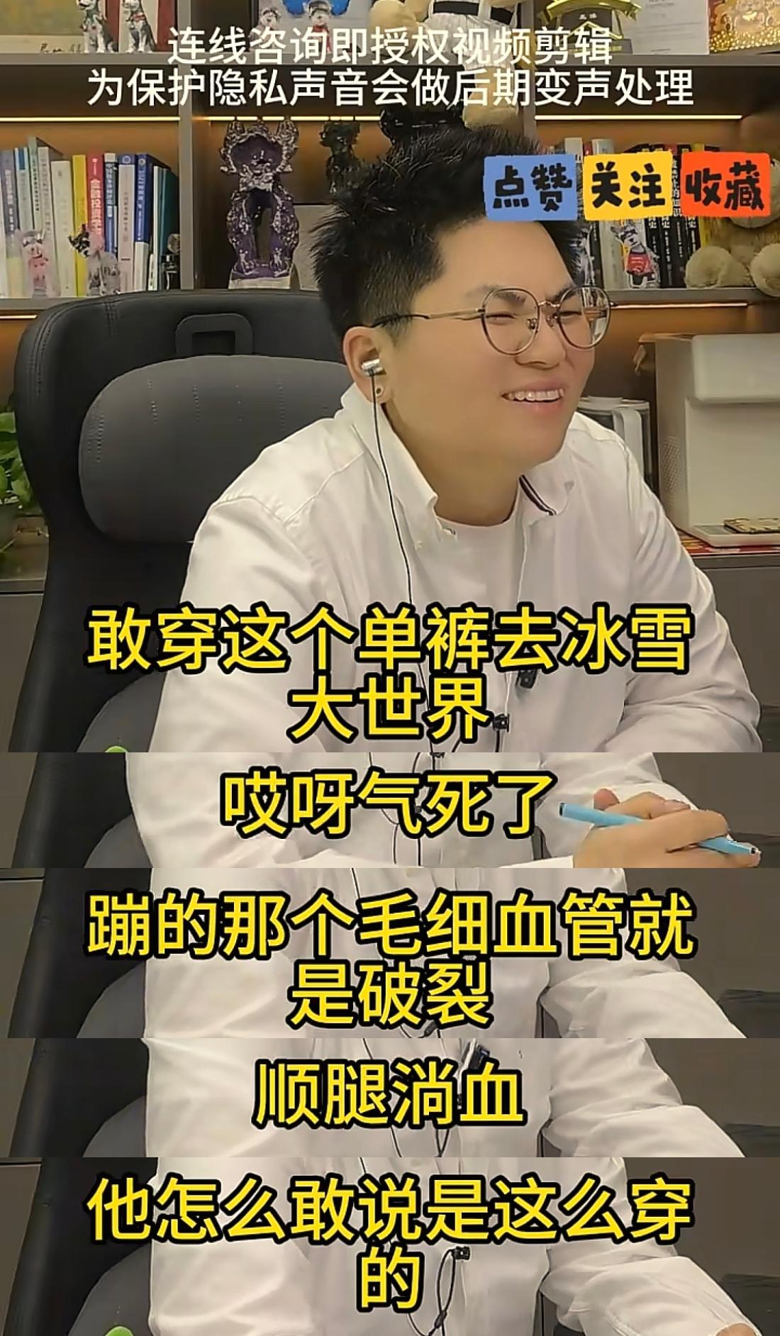 前幾天在網上有個人發視頻說穿着大短褲去冰雪大世界。這個醫生看了氣得要死。因爲太冷的話就會導致毛細血管破裂,甚至會出血。人家是冷的流鼻涕,你是冷得爆血管流血。