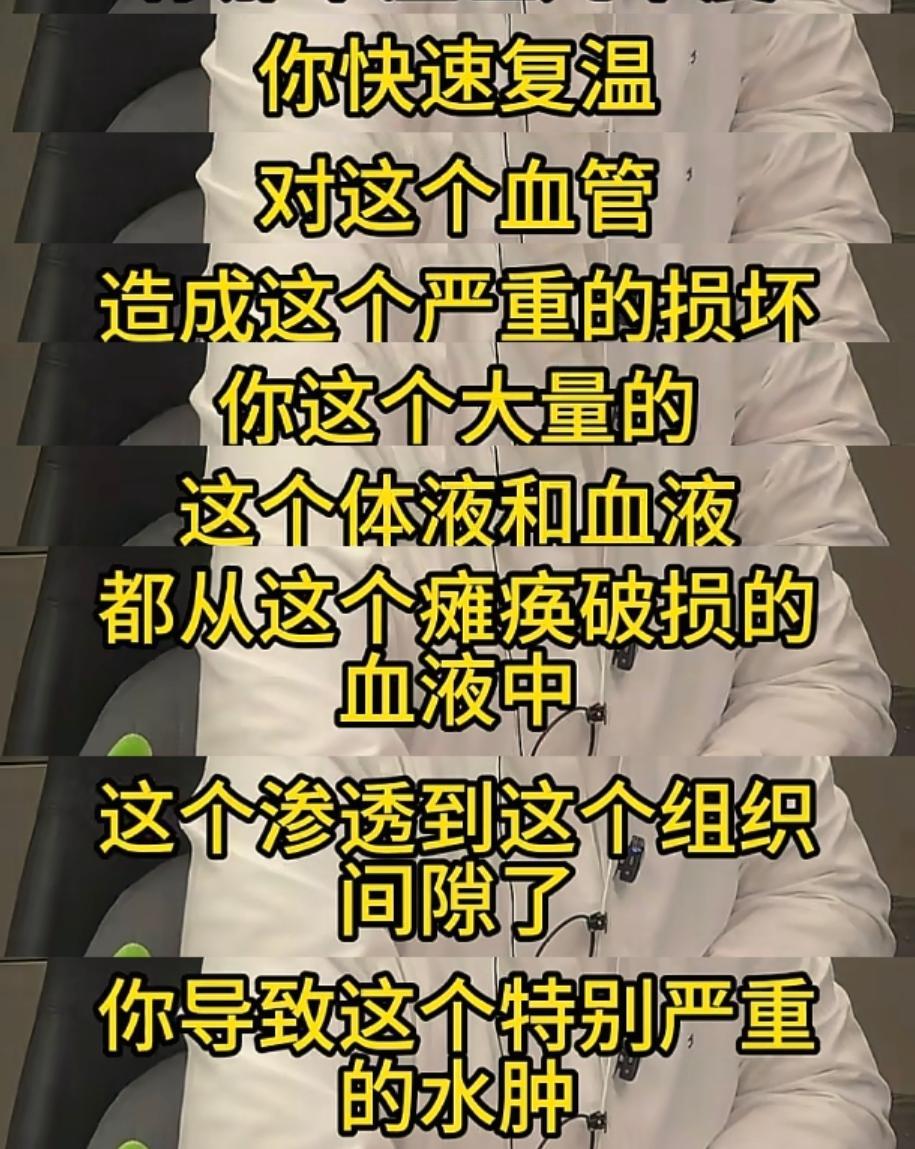 皮下毛細血管可能因極度收縮和後續的復溫不當而破裂,導致皮膚出現淤血、紫癜,也就是民間說的“凍出了血”。
