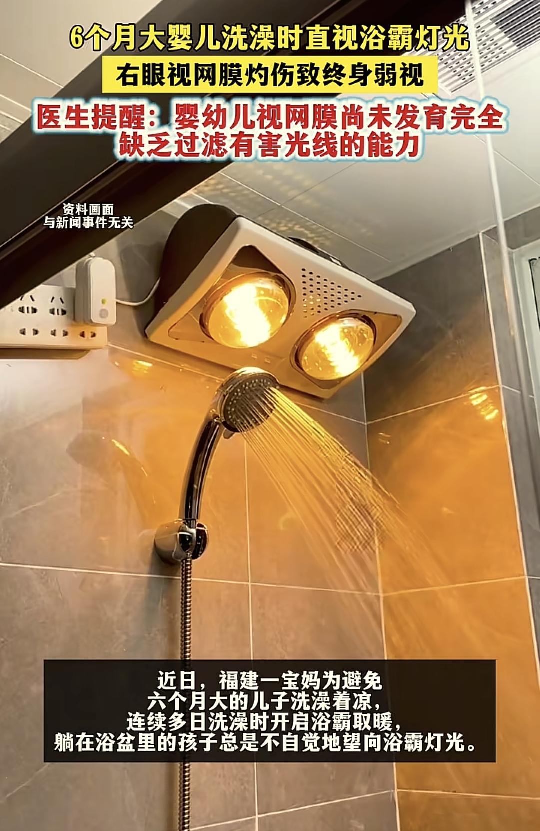 而很多家庭的浴霸就裝在天花板上面,整個浴霸的燈光就直直地照在孩子的臉上,對於小嬰兒來說,對於光是很好奇的,他又不太懂不舒服要自己做好防護。