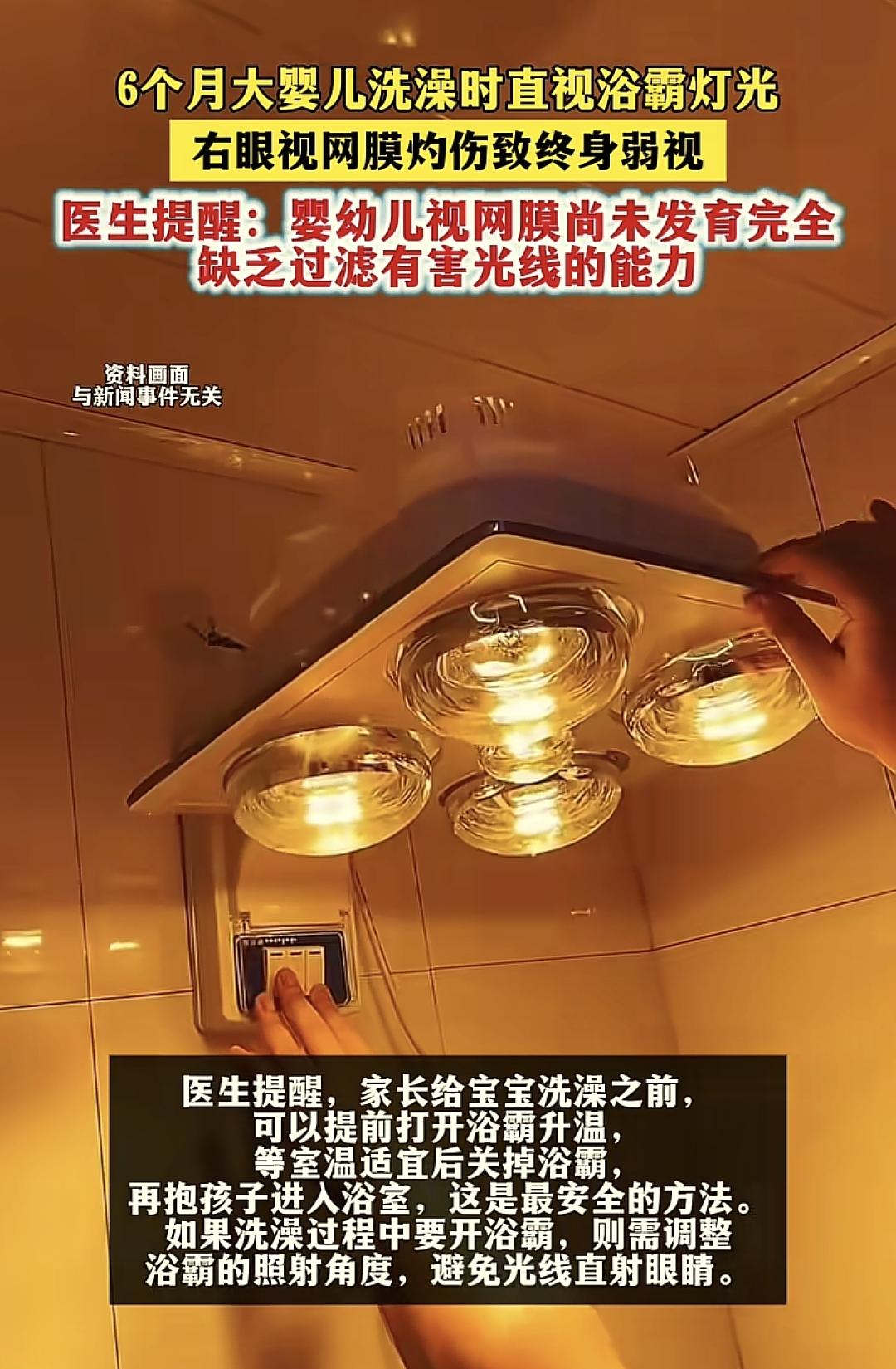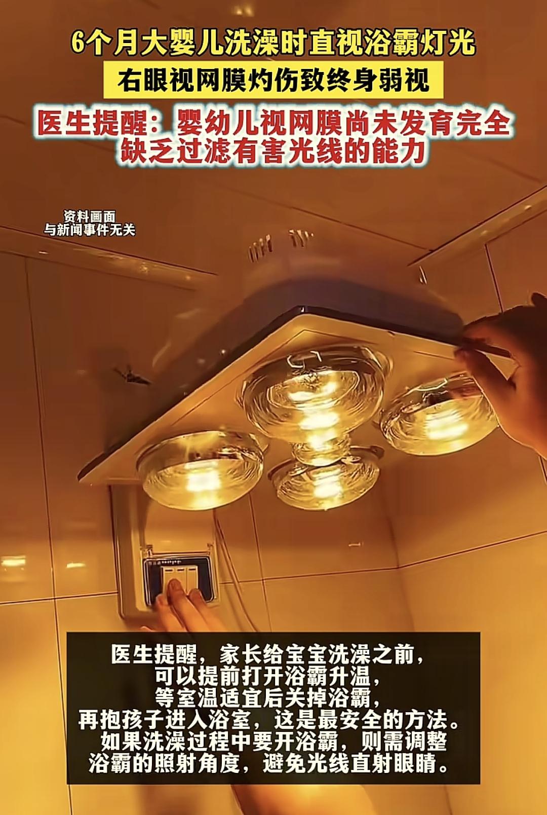 醫生也提醒,冬天給孩子洗澡的時候,如果要用浴霸的話,建議是打開浴霸,先把整個浴室照得比較溫暖了,孩子進入裏面的時候要關上浴霸,這樣給孩子洗澡的時候,孩子的眼睛就沒有辦法被被浴霸的強光所刺激。