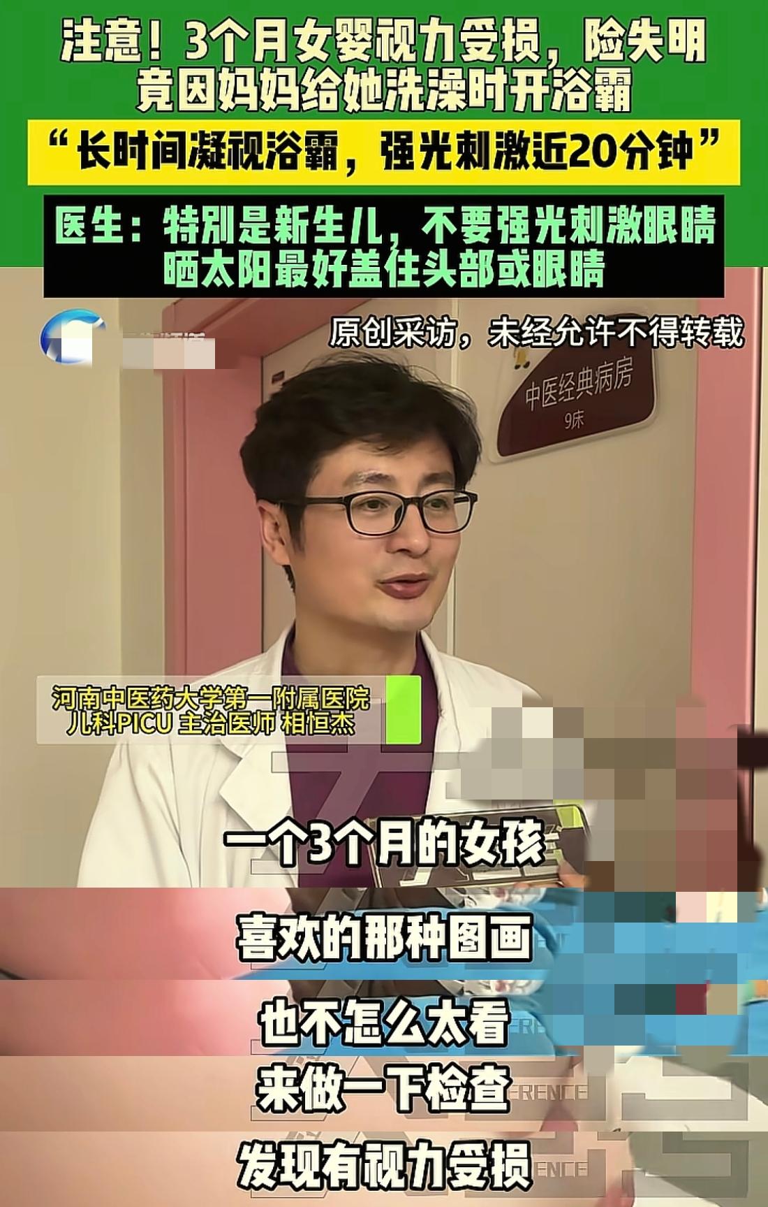 同樣的錯誤不僅是福建這個媽媽犯了,還有一個河南的媽媽,在冬天給孩子洗澡的時候也是開着浴霸,結果發現三個月的女兒給她看圖畫的時候,她好像沒有啥反應。