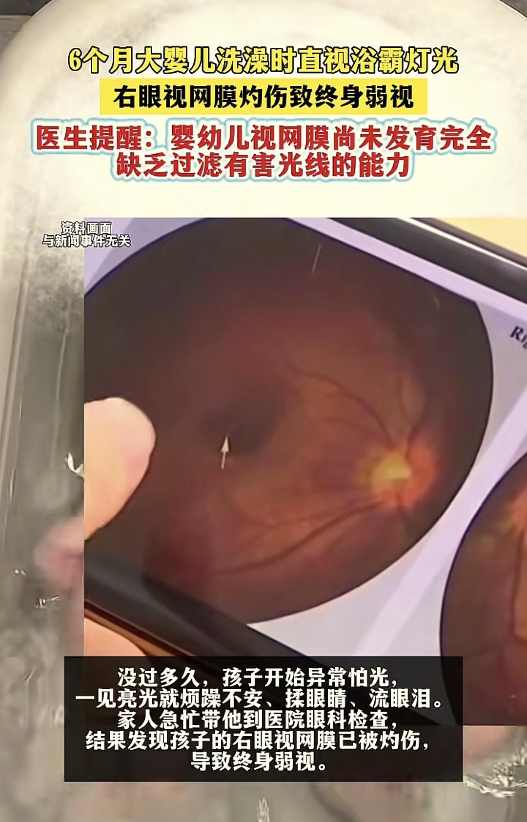 而追蹤弱視的原因是冬天媽媽給孩子洗澡的時候開着浴霸,孩子一直盯着浴霸看,浴霸這些強光對孩子的視網膜、晶狀體造成了永久的損傷,媽媽欲哭無淚。