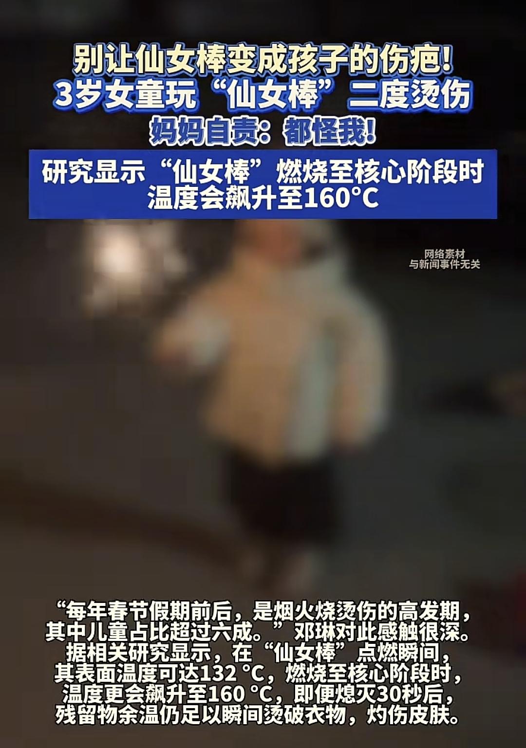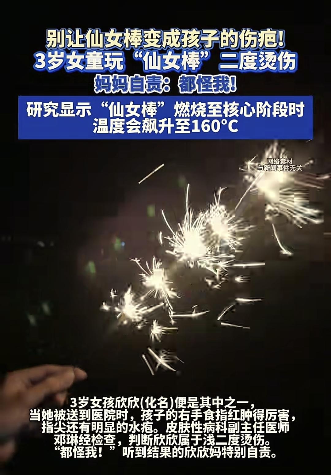 結果可想而知——剛剛燃盡的仙女棒,溫度高得嚇人。小手一碰,直接燙傷,小姑娘哇哇大哭。