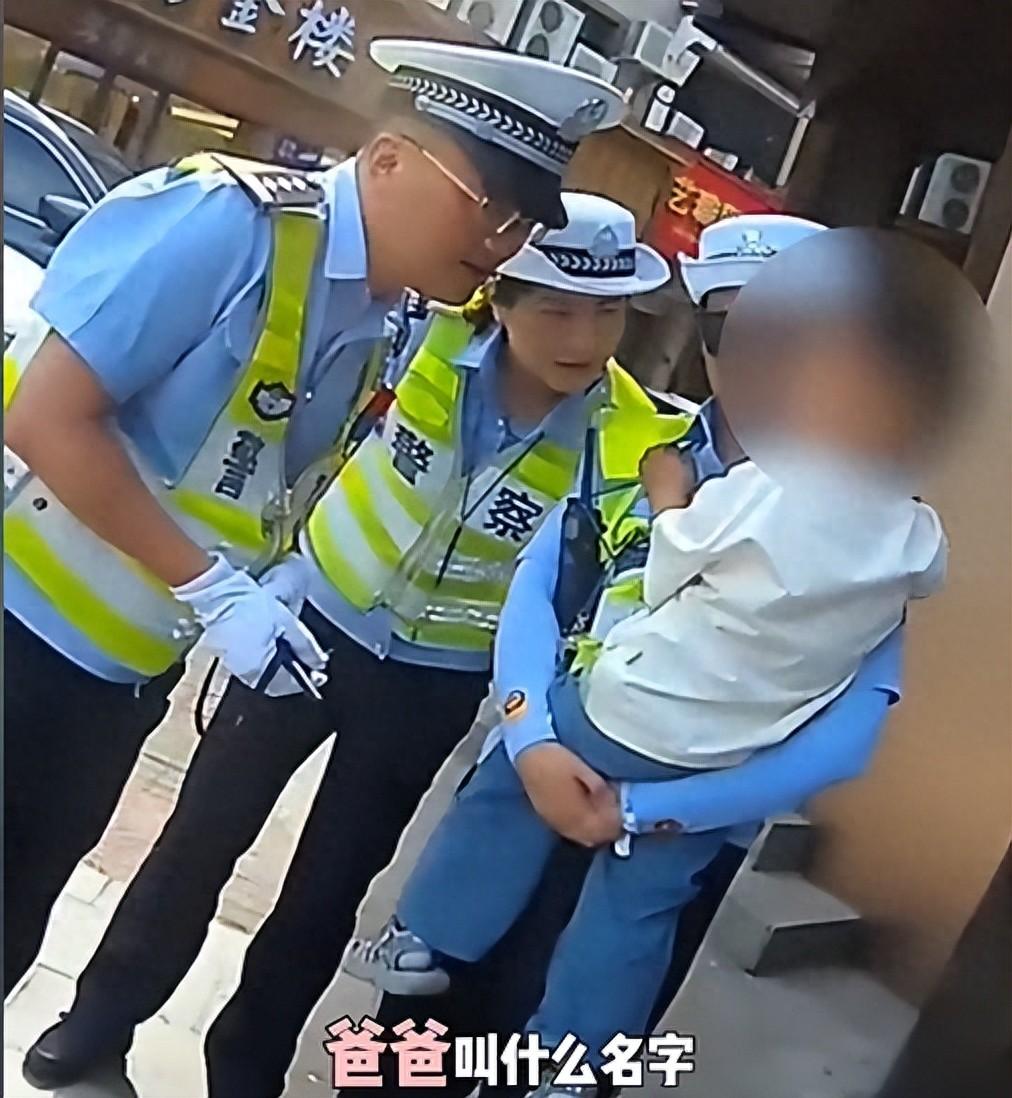 剛好有幾個警察在附近辦事,走過來看到這個孩子站在路邊哭,旁邊沒有父母,就知道這孩子應該是跟父母走丟了。一位女警察趕緊把孩子抱了起來,旁邊的警察就問這個兩歲的萌娃:“你的爸爸叫什麼名字?”