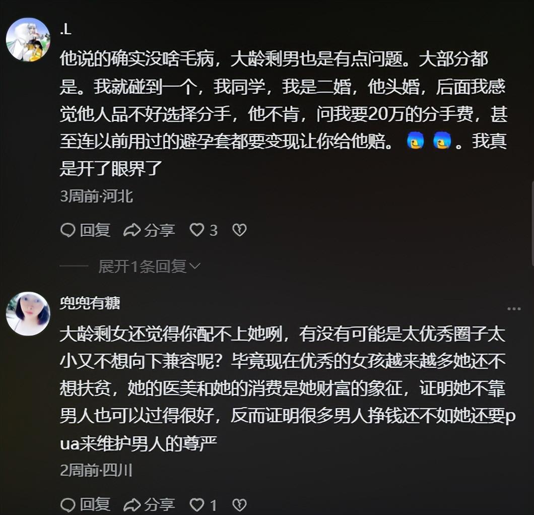 這番言論在網上引發熱議,評論區裏,有網友表示男生的話雖有幾分道理,但大齡剩男本身也存在問題。還有網友分享身邊案例,一位二婚男士和頭婚女生談戀愛,最後因男士人品不好女生選擇分手,可男士卻不依不饒,要求女生賠償 20 萬分手費,甚至連戀愛中用過的避孕套,都要求 AA 制。