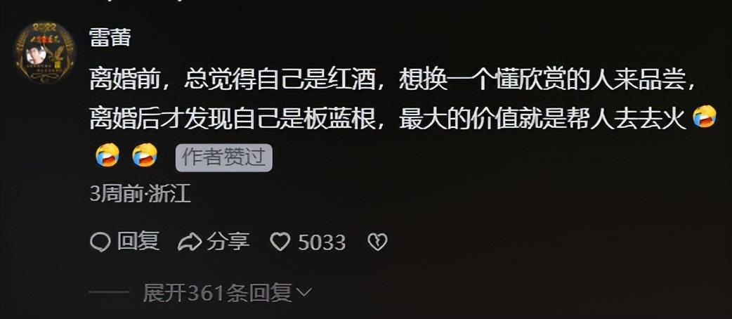 有浙江網友就分享,離婚前總覺得自己是紅酒,值得被懂的人欣賞,離婚後才發現自己成了板藍根,最大的價值只是 “幫人去火”。