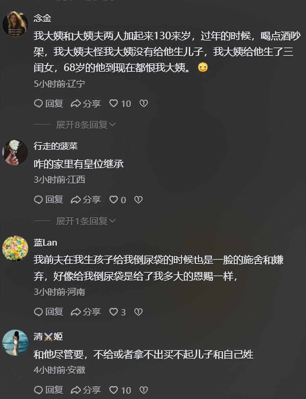 一個東北的網友說自己大姨生了三個女兒,兩人都退休了,女兒都結婚了大姨夫還怪大姨沒給他生兒子。
