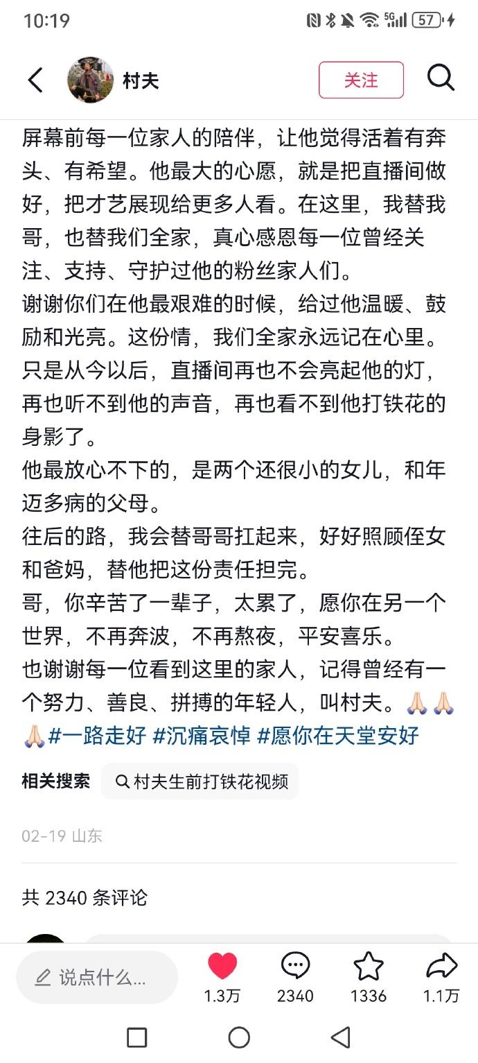 除夕夜,山東菏澤41歲的打鐵花網紅“村夫”,因一氧化碳中毒去世,留下兩個未成年的女兒。