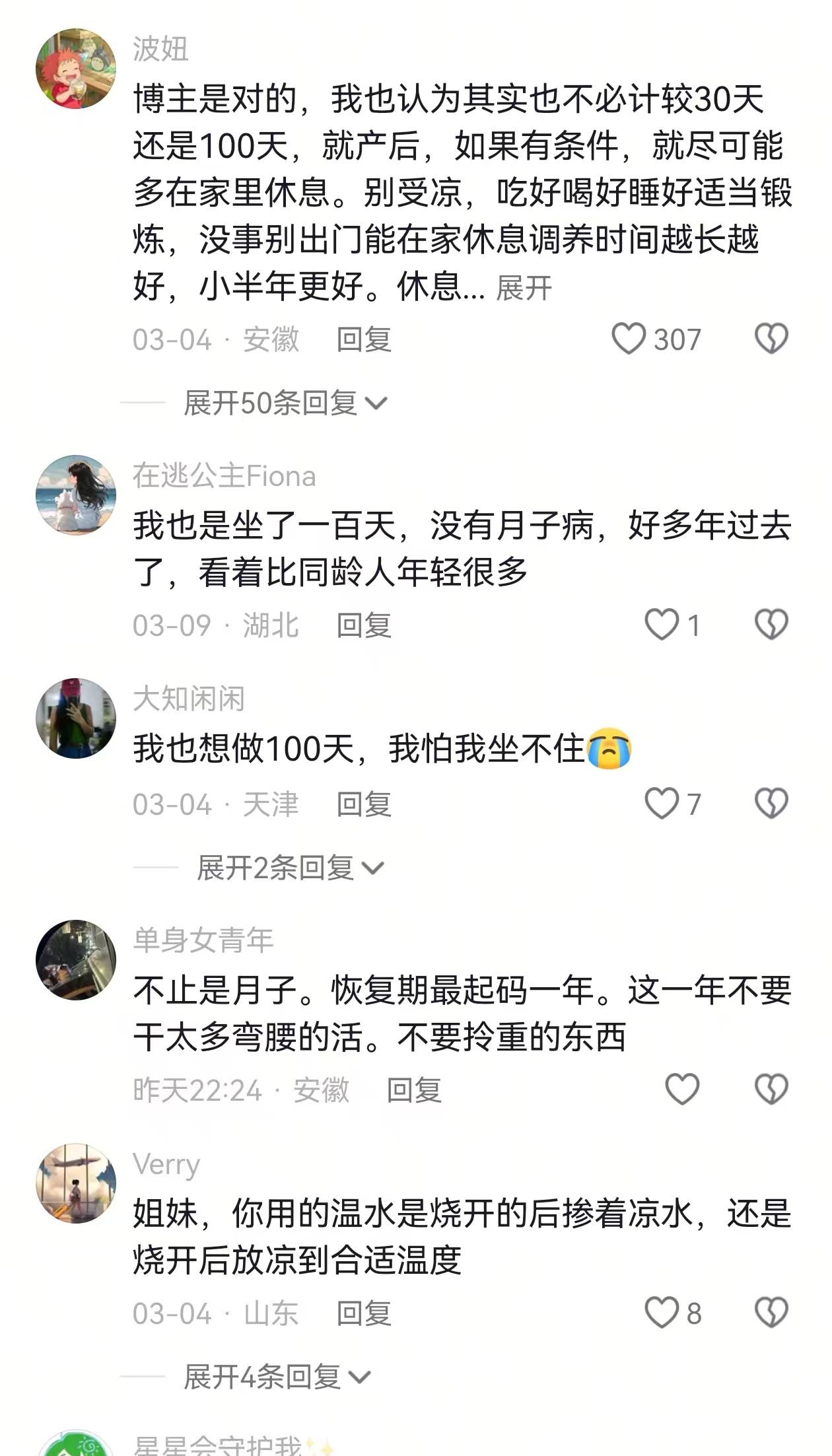 評論區有網友說得好:“也不是非計較30天還是100天,產後如果有條件,儘可能多在家休息,別受涼,喫好喝好睡好,沒事別出門,時間越長越好。”
