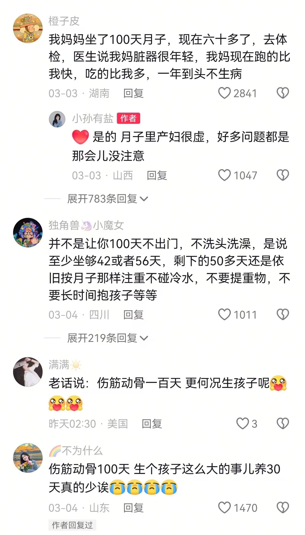評論區有個網友留言:“我媽媽坐了100天月子,現在六十多了,去體檢,醫生說我媽臟器很年輕,我媽現在跑得比我快,喫的比我多,一年到頭不生病。”