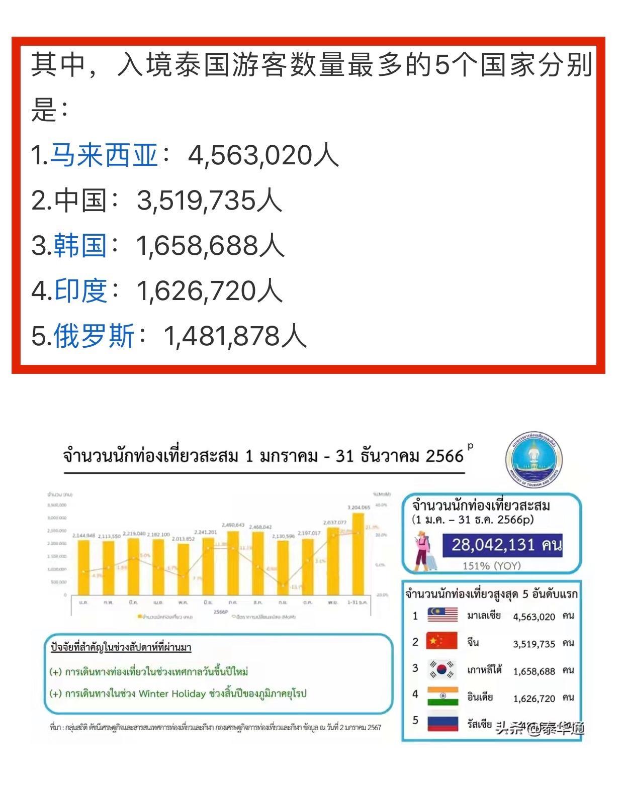 中國疫情之後,恢復出境遊,泰國作爲距離中國最近的旅遊國家,泰國官方2023年初非常看好中國龐大的旅遊羣體,起初預計是2023年整年接待500萬中國遊客,實際2023年底統計,中國去泰國旅遊人數只有350萬左右,遠低於預期,今年泰國總接待世界各國遊客總數爲2800萬人次,其中以歐美遊客居多。