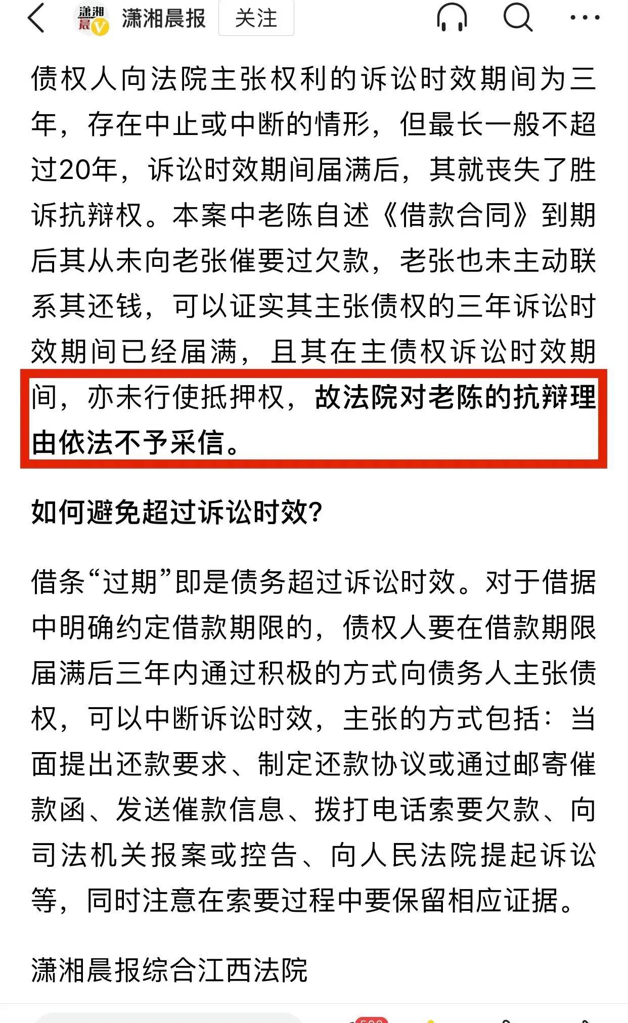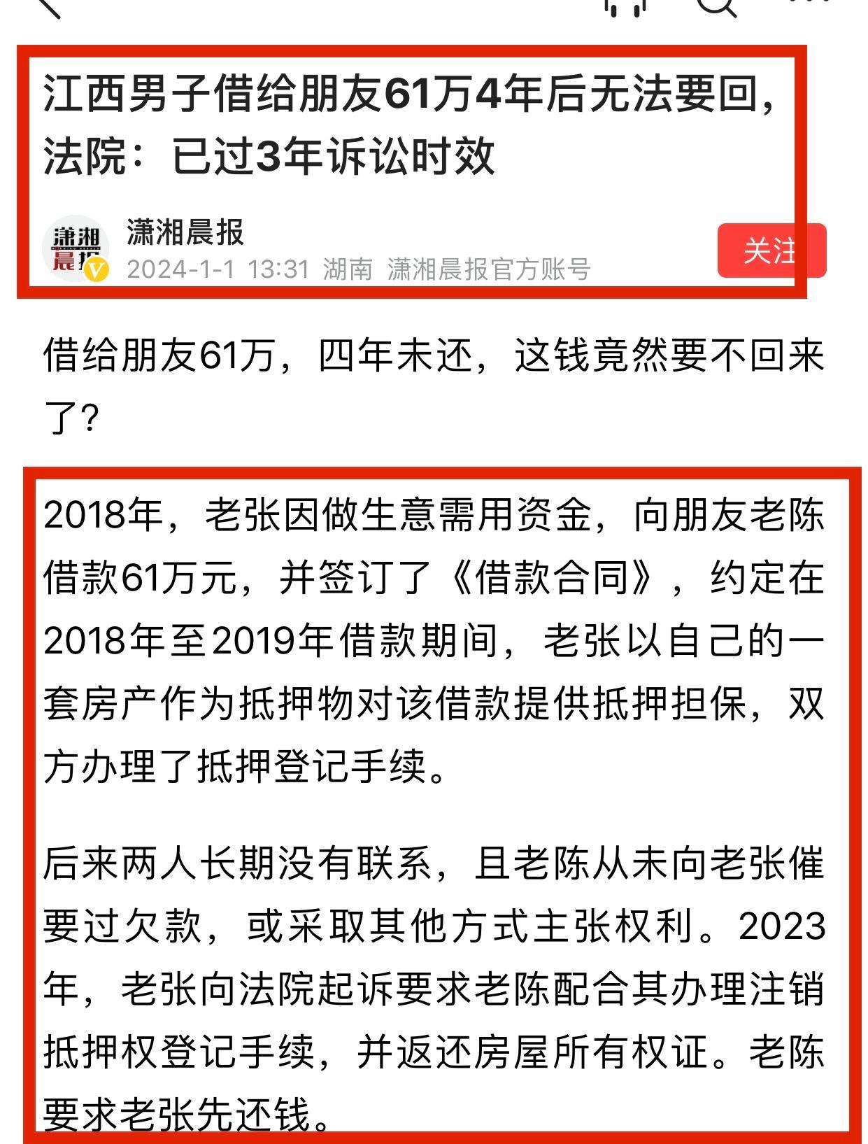 鐵頭說的事情大家2024年一定要記在心上,然而博主2024年第一天就看到一個新聞,事情發生在江西某地,2018年借款人老張因做生意急需用錢,就向朋友老陳借款61萬元作爲週轉資金,老張把自己一套房產作爲抵押,還走了正軌抵押擔保流程手續,然而合同有效期是2022年1月6日到期,老陳未向借款人老張催賬,老張也沒有主動還錢,然而等2023年老張要求執行抵押房產時候,朋友老張卻不認賬了,老陳一紙訴狀把老張告到法院,法院認爲訴訟三年有效期已經過時,不予支持老陳的起訴,這個事情告訴我們,最後落得一個身敗名裂,錢要不回來了,朋友都沒得做了。