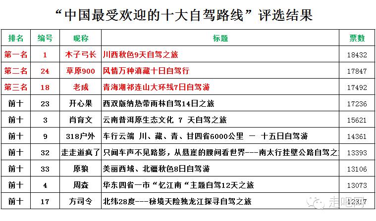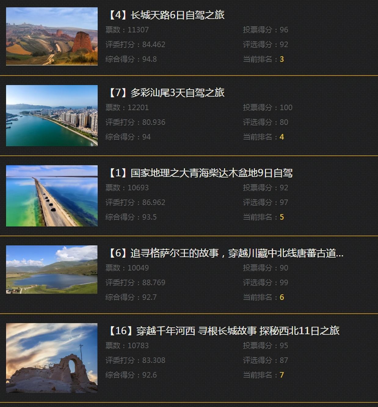 2、2024年3月11日12時正式啓動公開投票環節,由投票系統即時統計得票;參選自駕路線得分(專家評委分30%+網友投票分70%)最高的前10名獲獎;