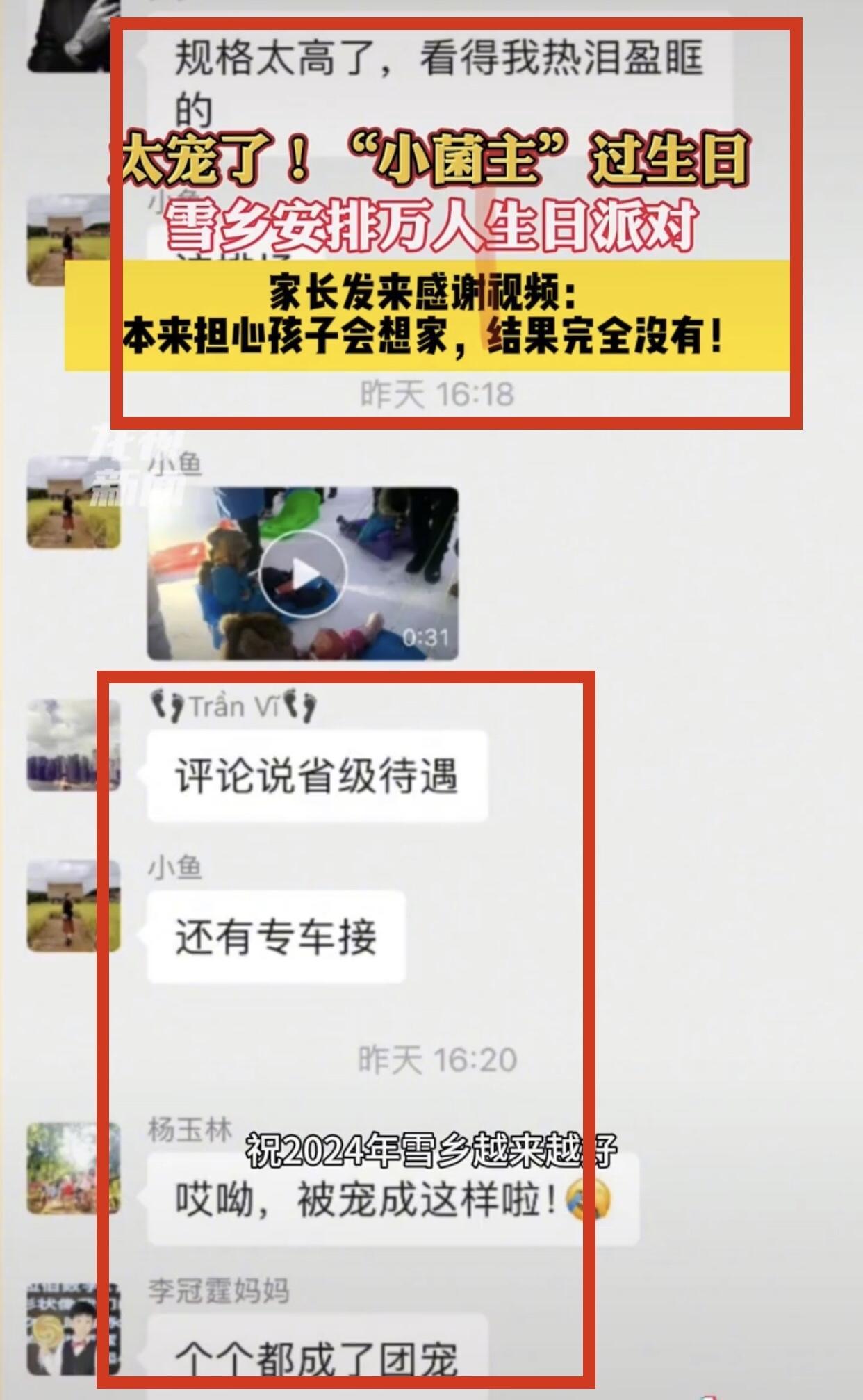 在西雙版納家長轉發了孩子在東北遊玩的視頻,被配文稱,孩子在東北被寵成這樣,家長們在羣裏說,東北老鐵太熱情把孩子寵成省級待遇,專車專人接送,很放心很開心,很感謝,安全得到放心,還得到全網網友關心。