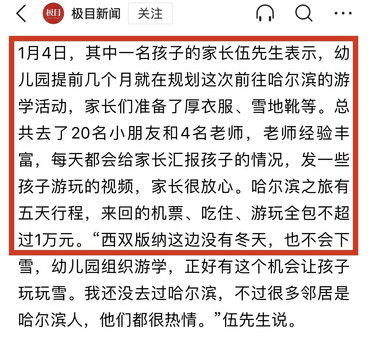 一位家長男士(伍先生)對媒體表示:他說西雙版納一年四季沒有冬天,孩子們都沒見過雪,這次去東北,孩子玩得特別開心,他問孩子想不想他,孩子說不想,他說這次研學旅行也是提前兩個月就準備了,孩子厚衣服都是提前兩個月就買好了,當孩子們在哈爾濱機場時候,穿的比較單薄,網友提醒該加衣服,他說孩子們厚衣服都在行李箱裏面,因爲從西雙版納20多度到哈爾濱零下十幾度是一個氣候大轉折。