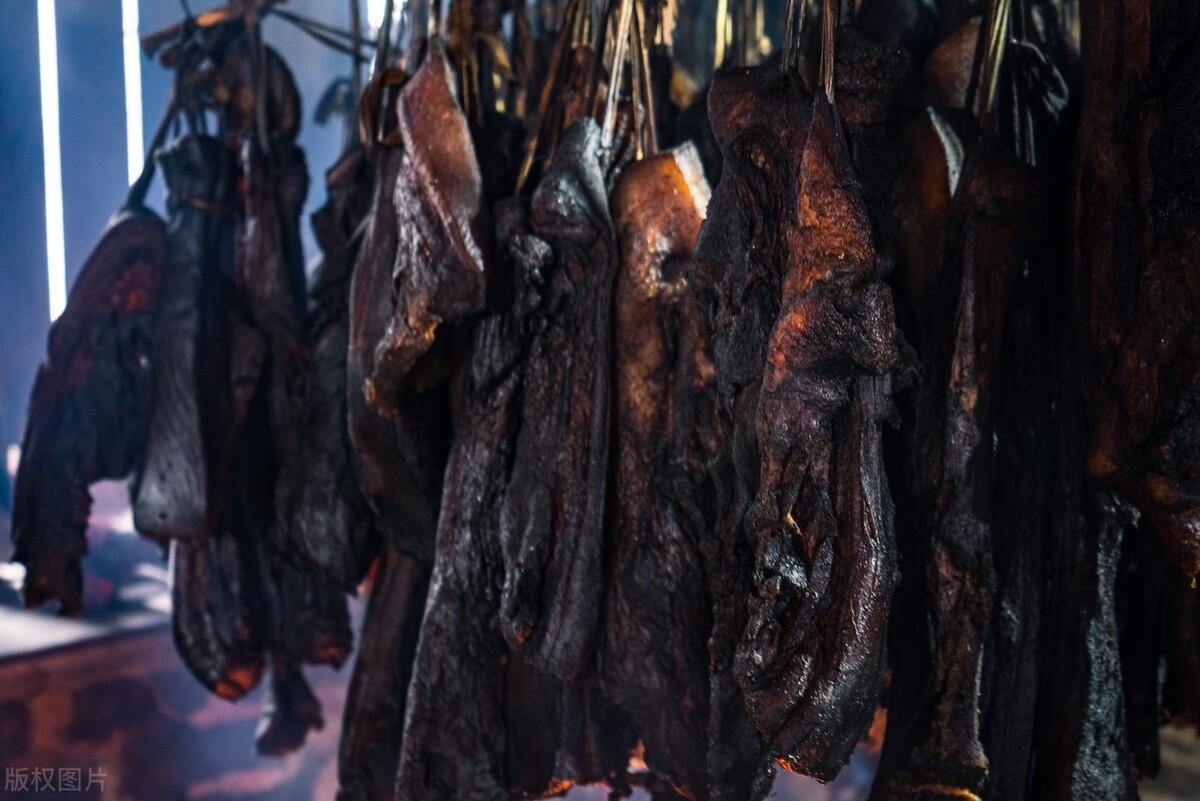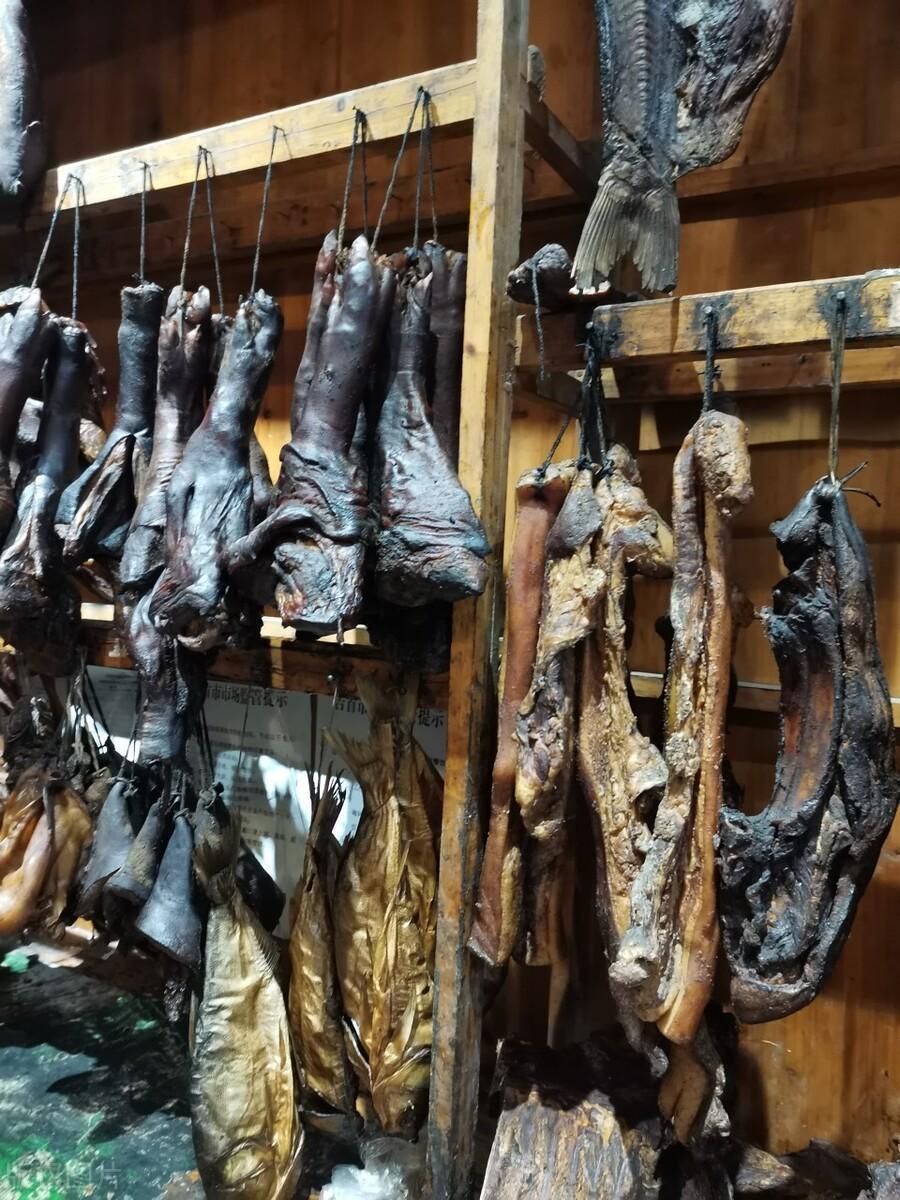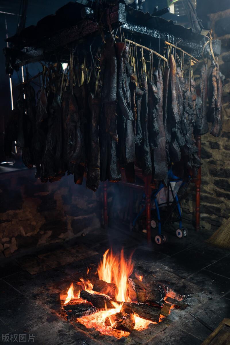 燻好後的臘肉,肉質變硬,肉色變深,煙火味嵌入肉中,回味悠長。燻乾的臘肉可以喫一整年。