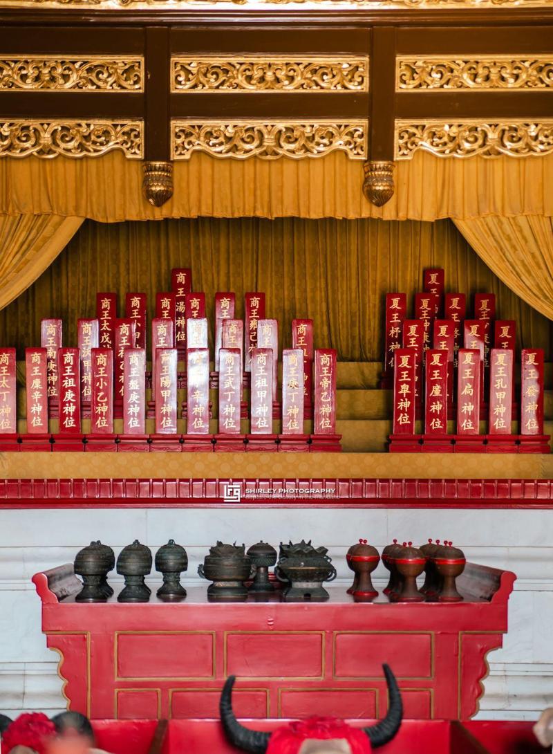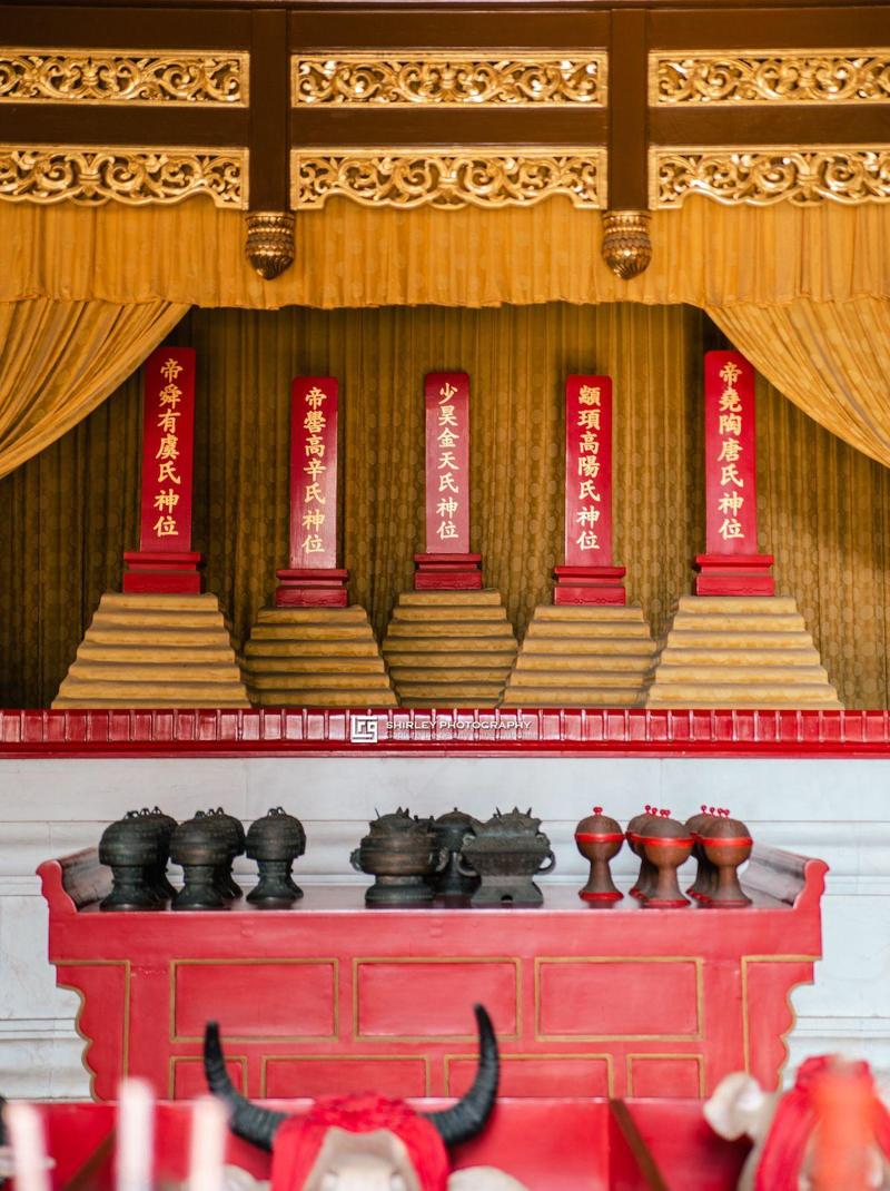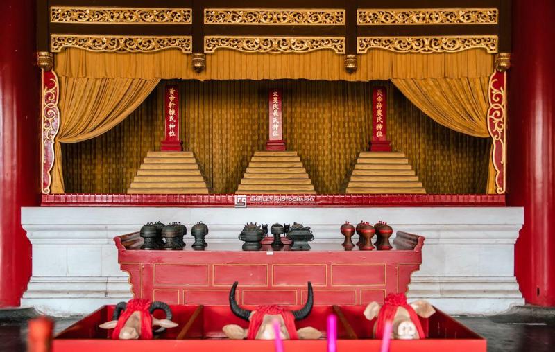 大殿裏一共有7個神龕,最中間供奉的是“三皇”(太昊伏羲氏、炎帝神農氏、黃帝軒轅氏),右手邊五個神位爲“五帝“(少昊、顓頊、嚳、堯、舜)。兩邊分列着夏、商、周、漢、魏、晉、唐(後唐)、宋、遼、金、元、明的帝王神位。