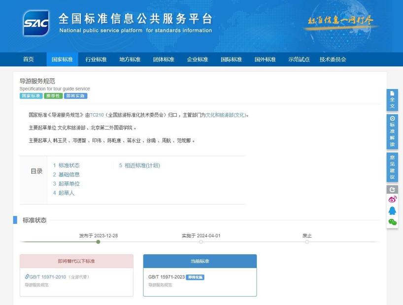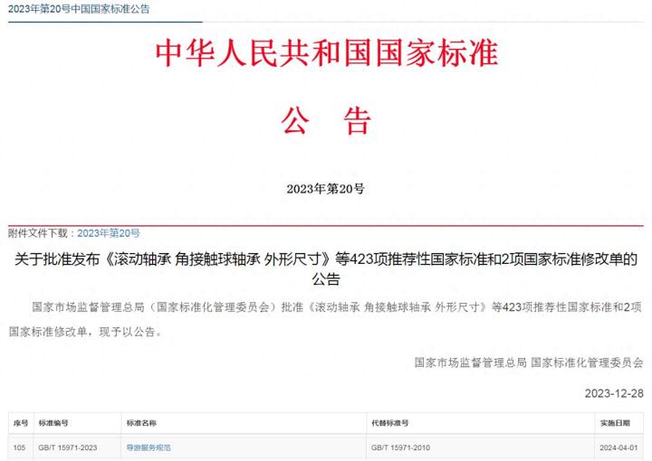 國家市場監督管理總局(國家標準化管理委員會)日前批准發佈423項推薦性國家標準和2項國家標準修改單。由文化和旅遊部主管、全國旅遊標準化技術委員會歸口及執行的國家標準《導遊服務規範》(GB/T 15971-2023)位列其中。該標準是對原國家標準的修訂,將於4月1日起實施。