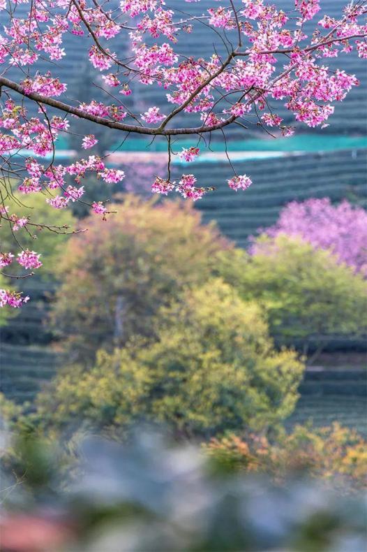 10W株櫻花依次盛開在5萬畝的茶園內,