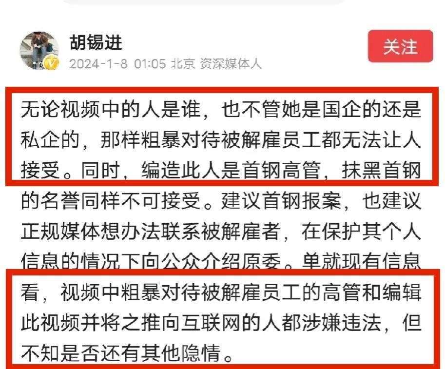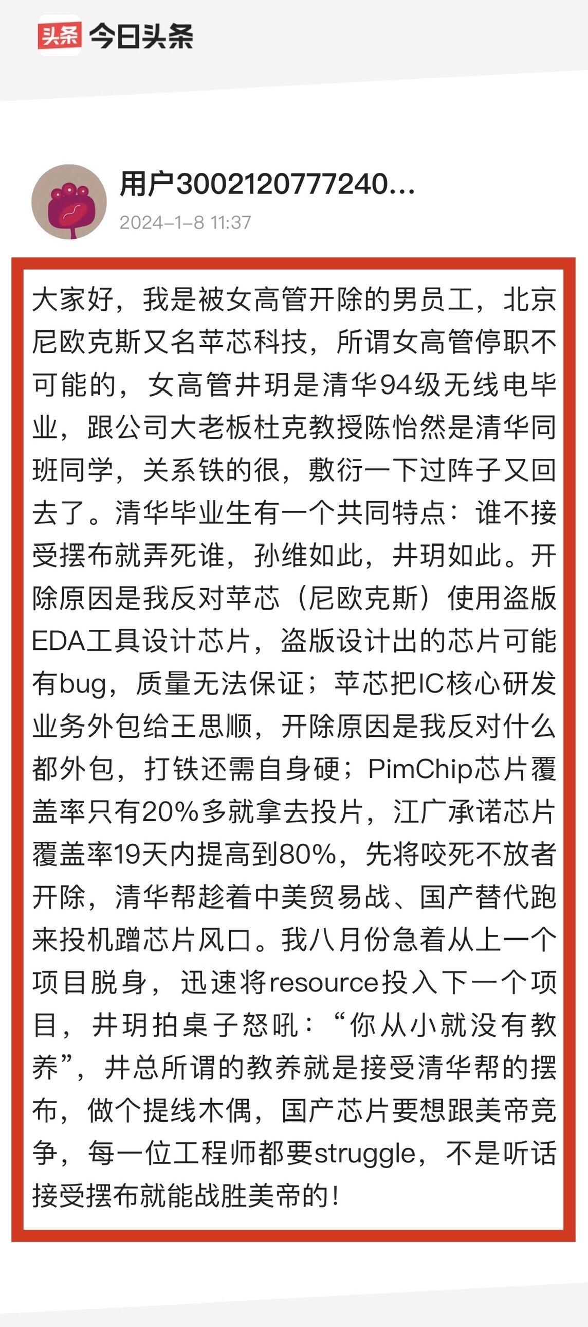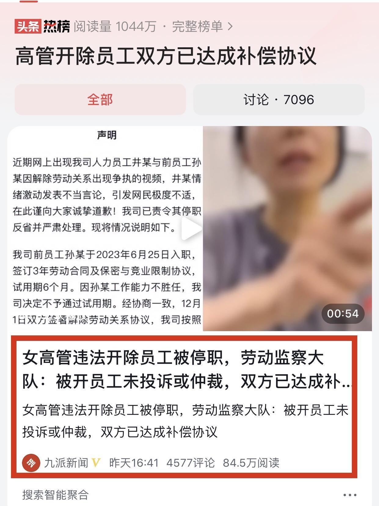 1月8日晚間衝上頭條熱搜爲解聘員工當事人發視頻稱,自己就是被女高管解除當事人,起因是他對公司研發管理流程不正規,使用盜版軟件,以及外包流程,然後8月份與與高管井某發生一次衝突,被叫到辦公室訓話,說他沒有教養,他說誰不聽公司高管話就說誰沒有教養。