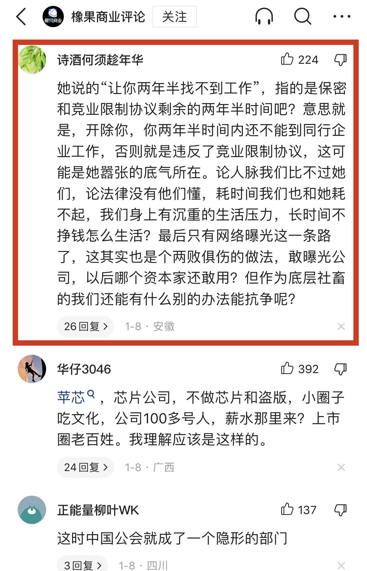 2、她說的“讓你兩年半找不到工作”,指的是保密和競業限制協議剩餘的兩年半時間吧?意思就是,開除你,你兩年半時間內還不能到同行企業工作,否則就是違反了競業限制協議,這可能是她囂張的底氣所在。論人脈我們比不過她們,論法律沒有他們懂,耗時間我們也和她耗不起,我們身上有沉重的生活壓力,長時間不掙錢怎麼生活?最後只有網絡曝光這一條路了,這其實也是個兩敗俱傷的做法,敢曝光公司,以後哪個資本家還敢用?但作爲底層社畜的我們還能有什麼別的辦法能抗爭呢?