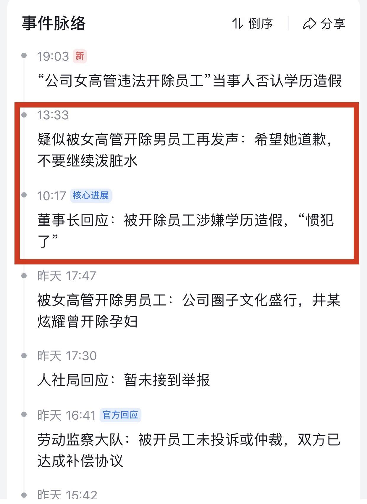 女高管違法解除男員工後,根據《九派新聞》1月9日報道:公司董事長陳某否認了員工說女高管跟自己是校友同班同學關係(員工說法不屬實),陳某稱,這名被開除的男員工學歷造假,並且經常碰瓷一些公司,是老慣犯了。