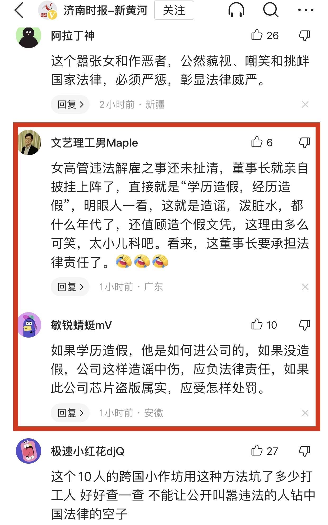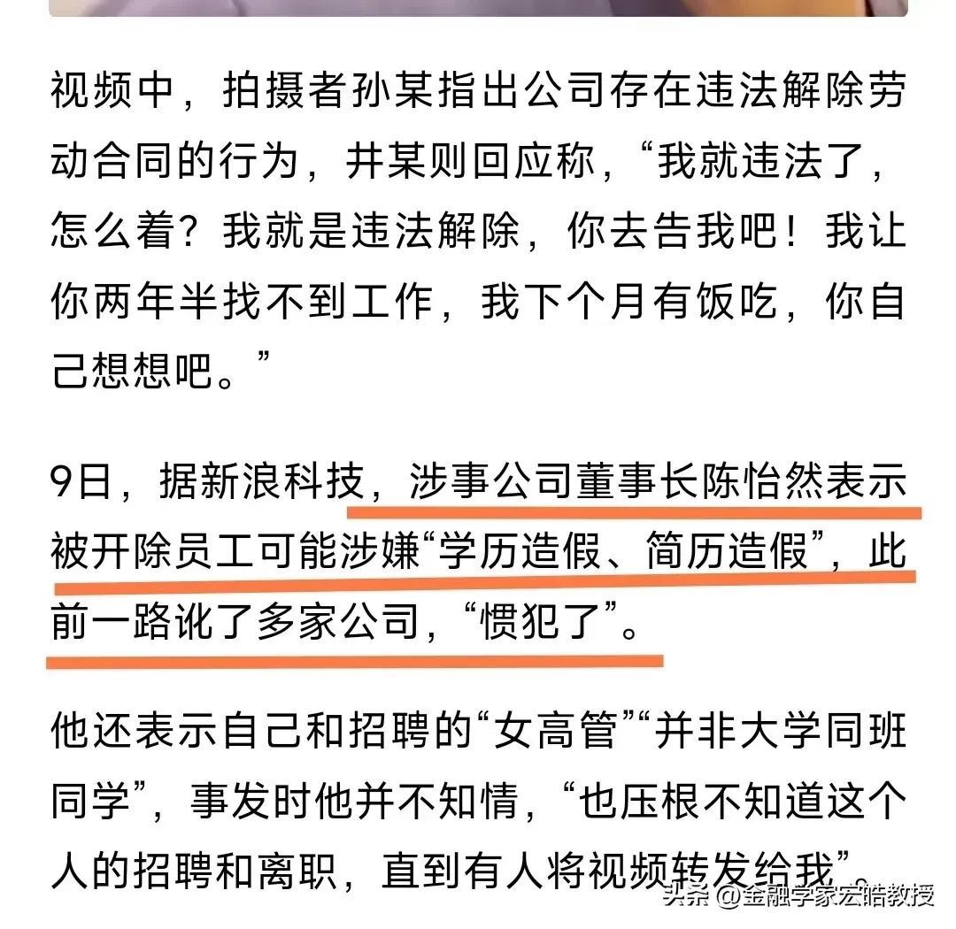 3、女高管違法解僱只是還未扯清,董事長就親自披掛上陣了,直接就是“學歷造假,經歷造假”,明眼人一看,這就是造謠,潑髒水,都什麼年代了,還值顧造個假文憑,這理由多麼可笑,太小兒科吧。看來,這董事長要承擔法律責任了。