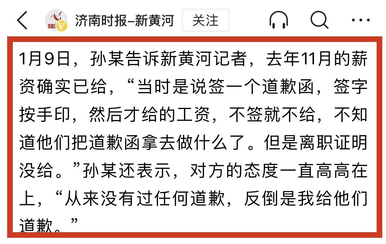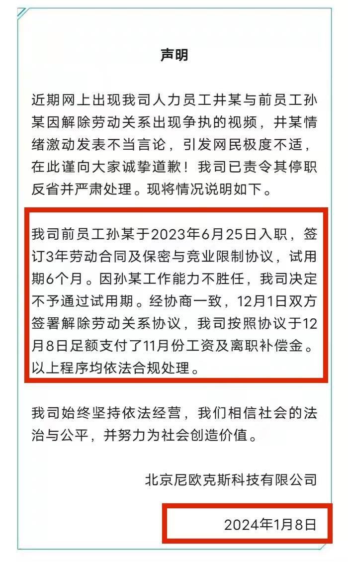 目前最新消息是:根據(北京尼歐克斯科技有限公司)1月8日官方發佈一份公司通告,孫某不能勝任公司工作,2023年12月1日雙方達成協議解除勞動關係,12月8日支付了孫某11月份工資,以及離職補償金。然而孫某說自己簽了一份道歉函纔拿到工資。