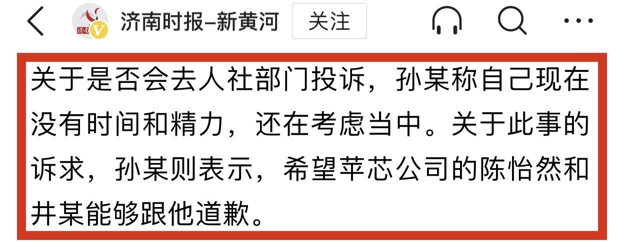 濟南時報新黃河1月9日採訪孫某,問他要不要打算訴訟,他說沒有精力和時間去訴訟,現在要求就是公司給他道歉。