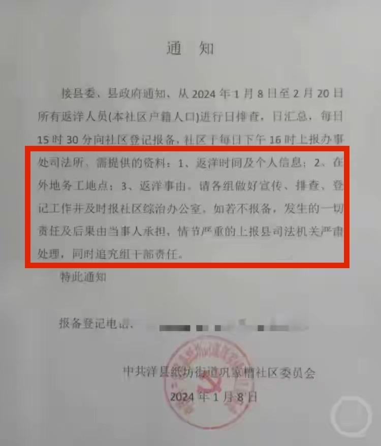 然而1月8日陝西洋縣一份務工人員回鄉過年需要向社區報備通知在網上流傳,引發網友關注,事情發生在陝西洋縣紙坊街道鞏家槽社區,通告中指出重要三個問題: