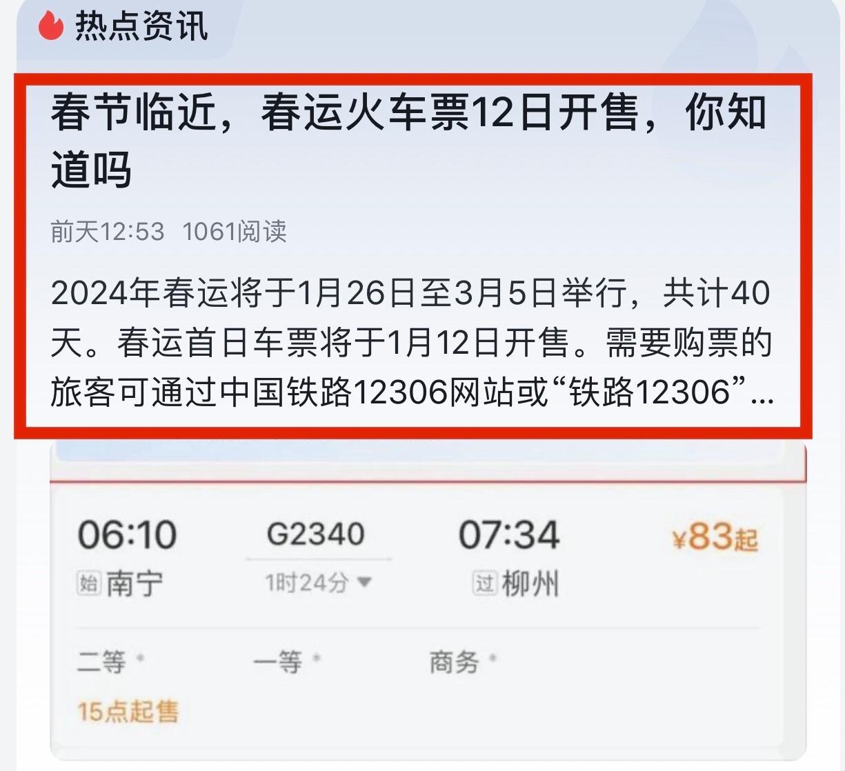 年關將至,又要開啓一年一度在外務工人員返鄉大潮,將迎來一年一度春運,堪稱全世界流動人口最大的節日,2024年春運1月12日開啓預售票,1月26日至3月5日爲春運,一共40天,其中春節假期9天。