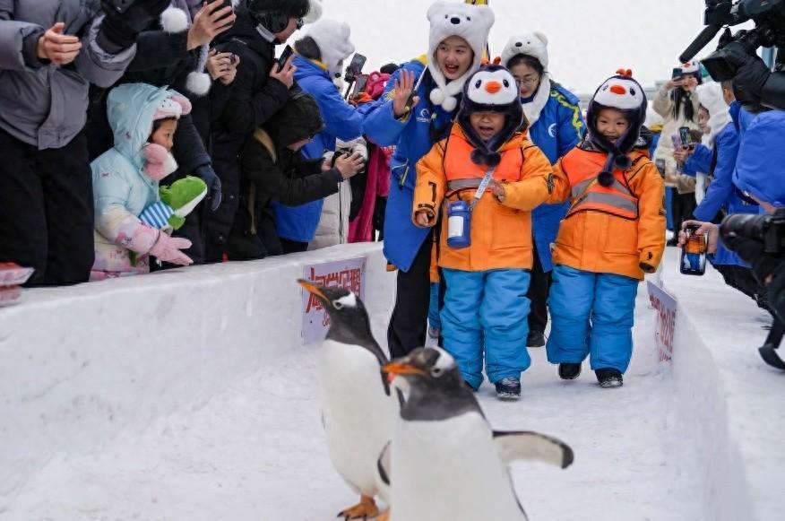 近日,11名來自廣西南寧的小朋友來到黑龍江哈爾濱極地公園參觀遊覽。圖爲小朋友們與企鵝互動。 中新社發 趙宇航 攝