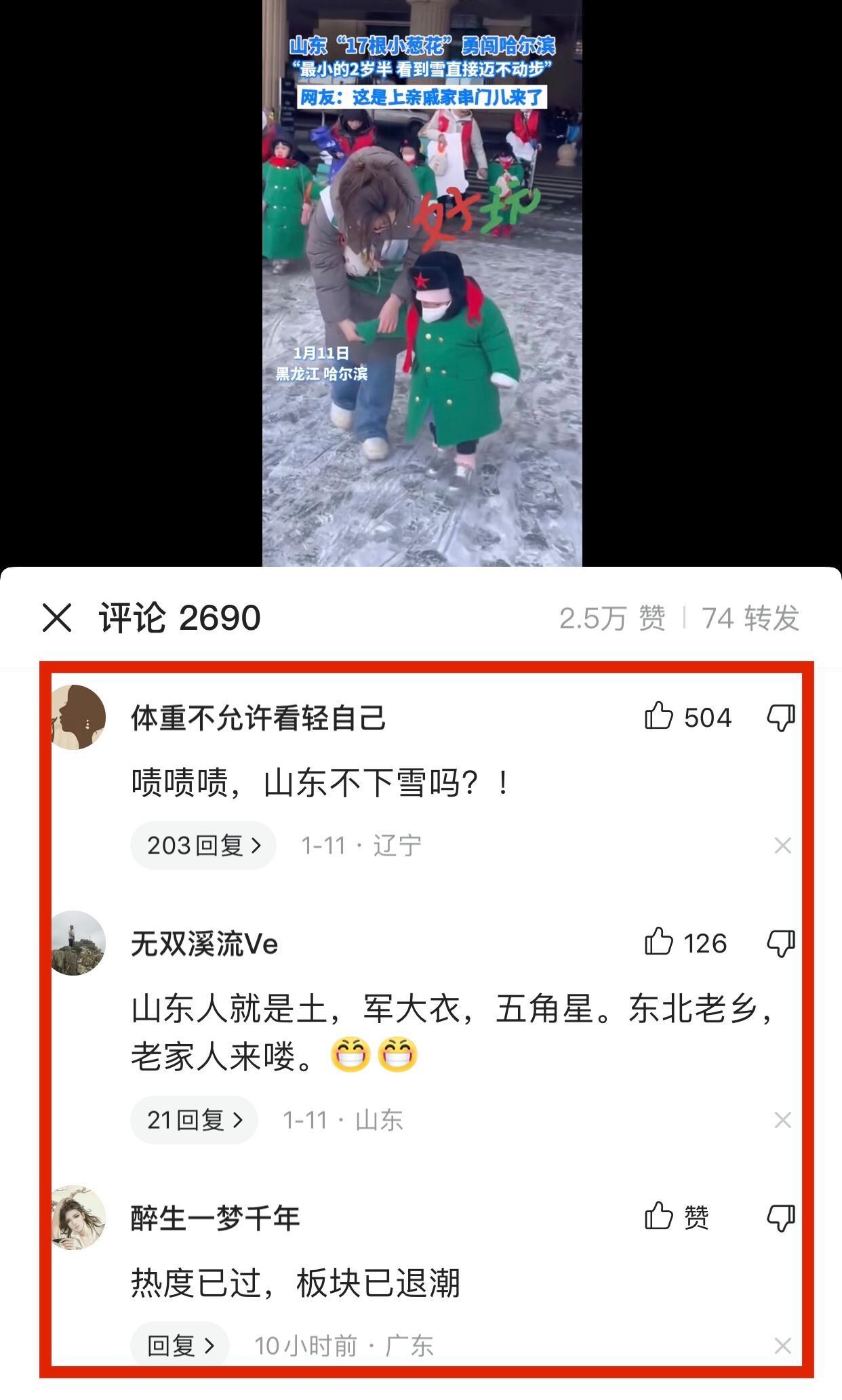 據旅遊熱搜榜消息:帶隊老師講述,她們這家幼兒園並非第一次研學旅行,之前研學旅行去過北京、南京、滕州、泰安等地,這次選擇哈爾濱之行,有兩個目的,第一個還是因爲這次哈爾濱旅遊火了,就想來看看。第二個原因就是山東與東北有一定歷史淵源,主要是祖輩闖關東,所以這次也是借這個事情重走闖關東之旅,山東人作爲孃家人,這次來爾濱是走親戚串門。
