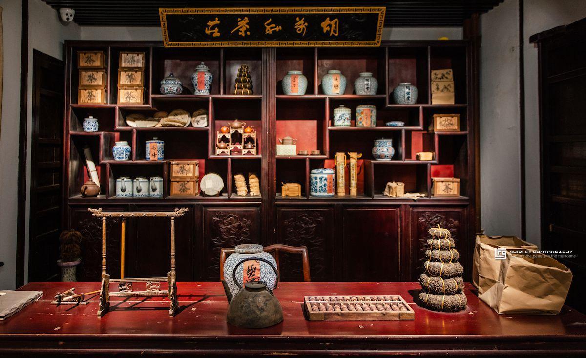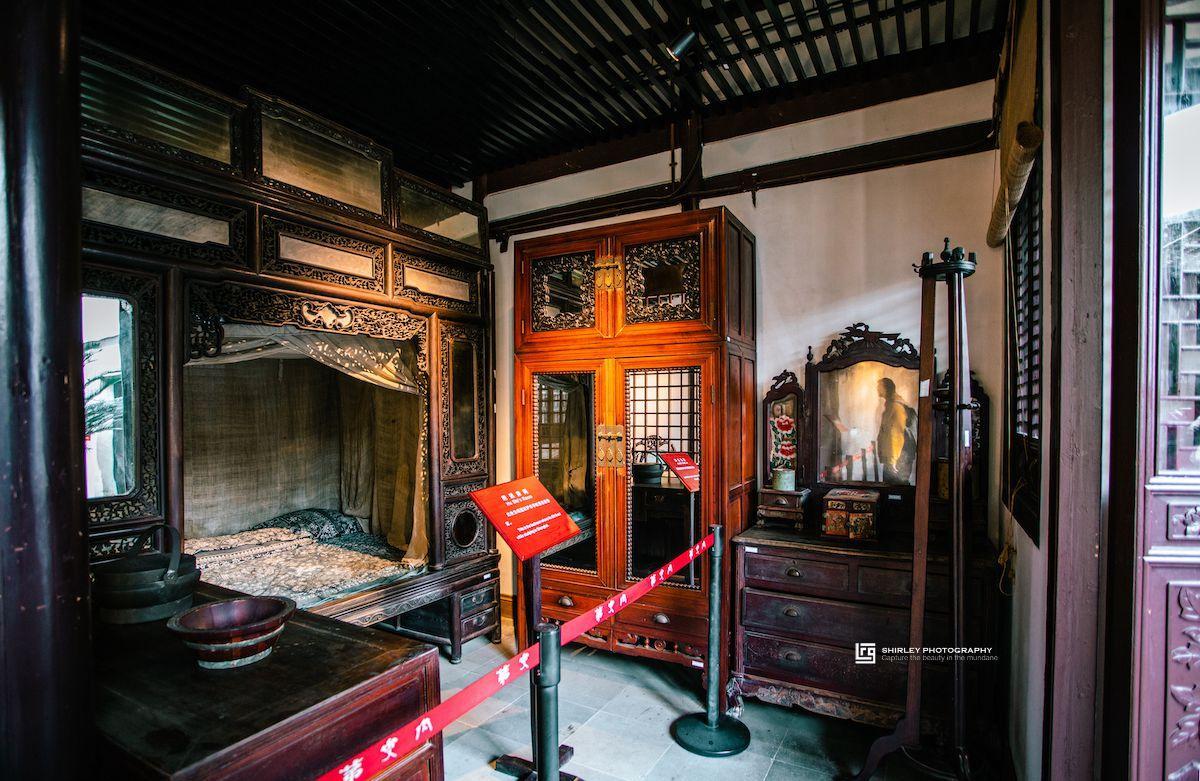 對面的東廂房是胡適和母親的臥房。目前復原了後來胡適在滬求學居住的臥室場景,裏面擺放了按年代復原的室內傢俱妝臺,以及胡適生前用過的茶具等。