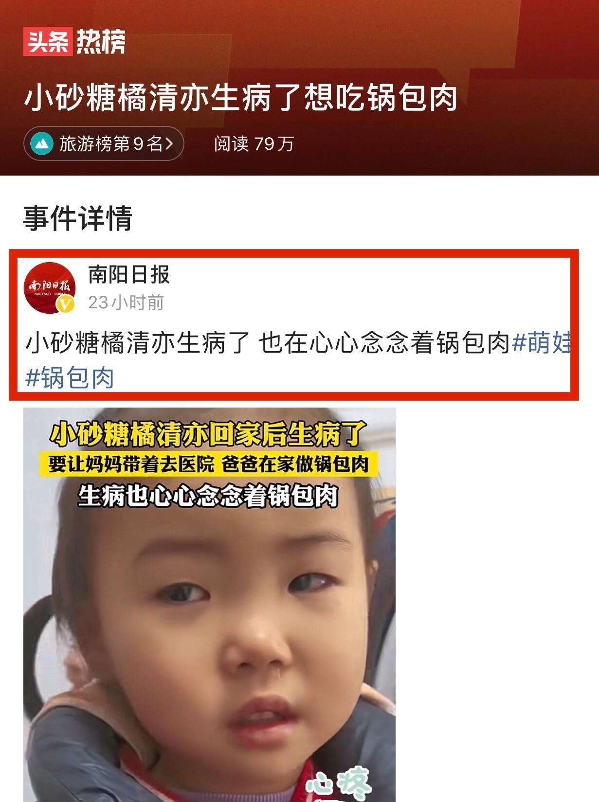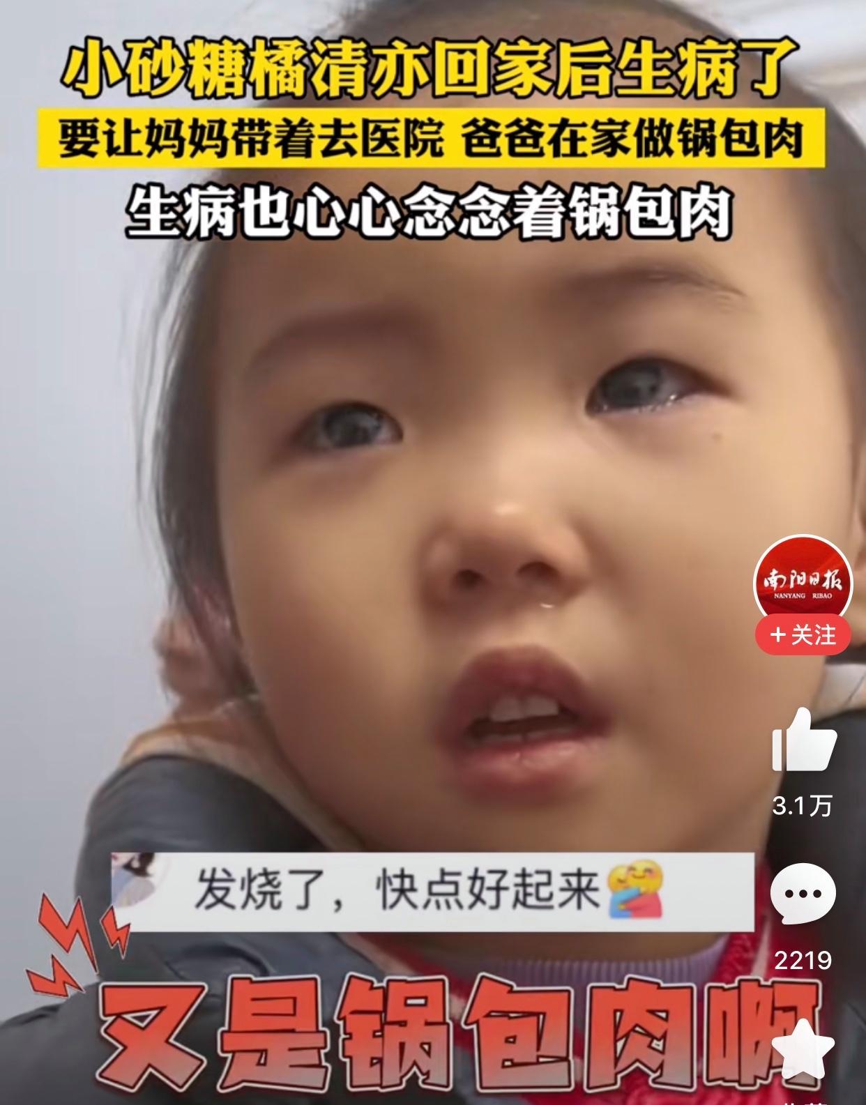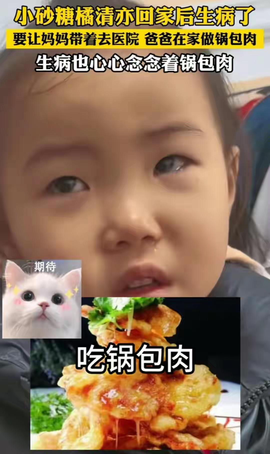 感冒時候,橘三歲爸爸問她喜歡喫什麼,她果斷說啦東北的鍋包肉,她的父親在問她,爸爸做的鍋包肉好喫還是東北鍋包肉好喫,她說吉林鍋包肉好喫,吉林網友看到了這個肯定簡直樂翻天了,他們說橘三歲就是吉林鍋包肉代言人,童言無忌,小孩子不說假話。