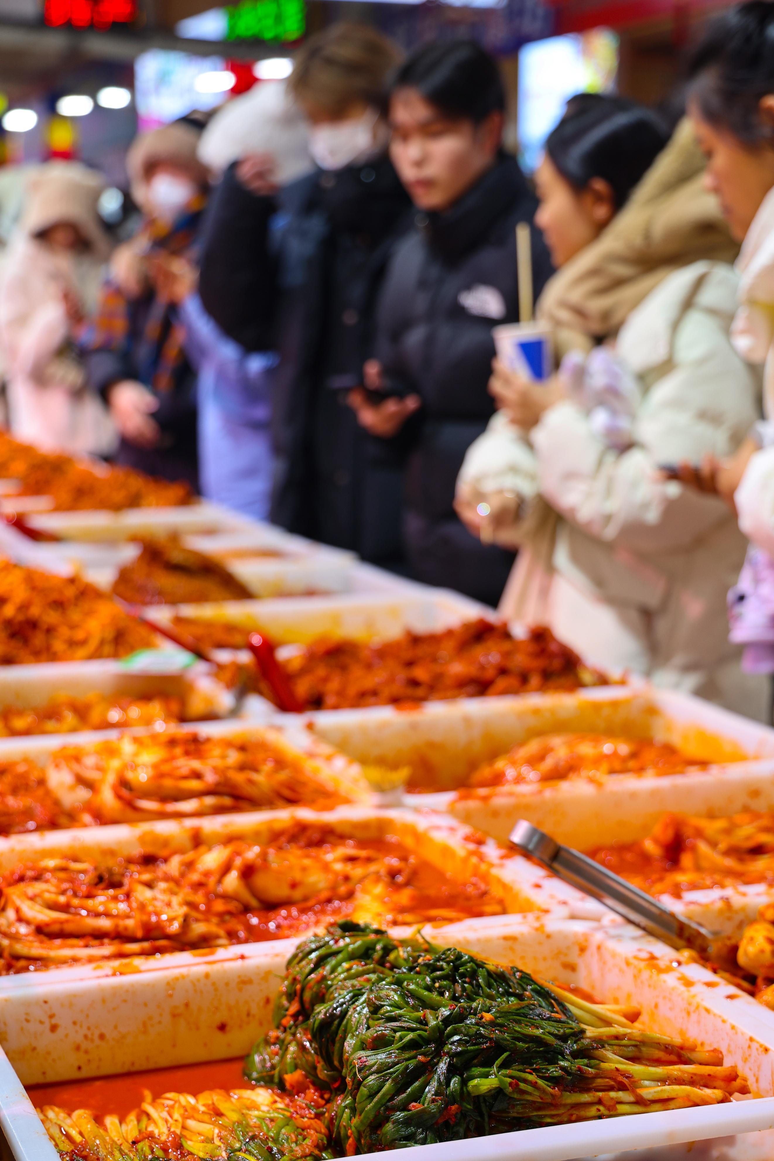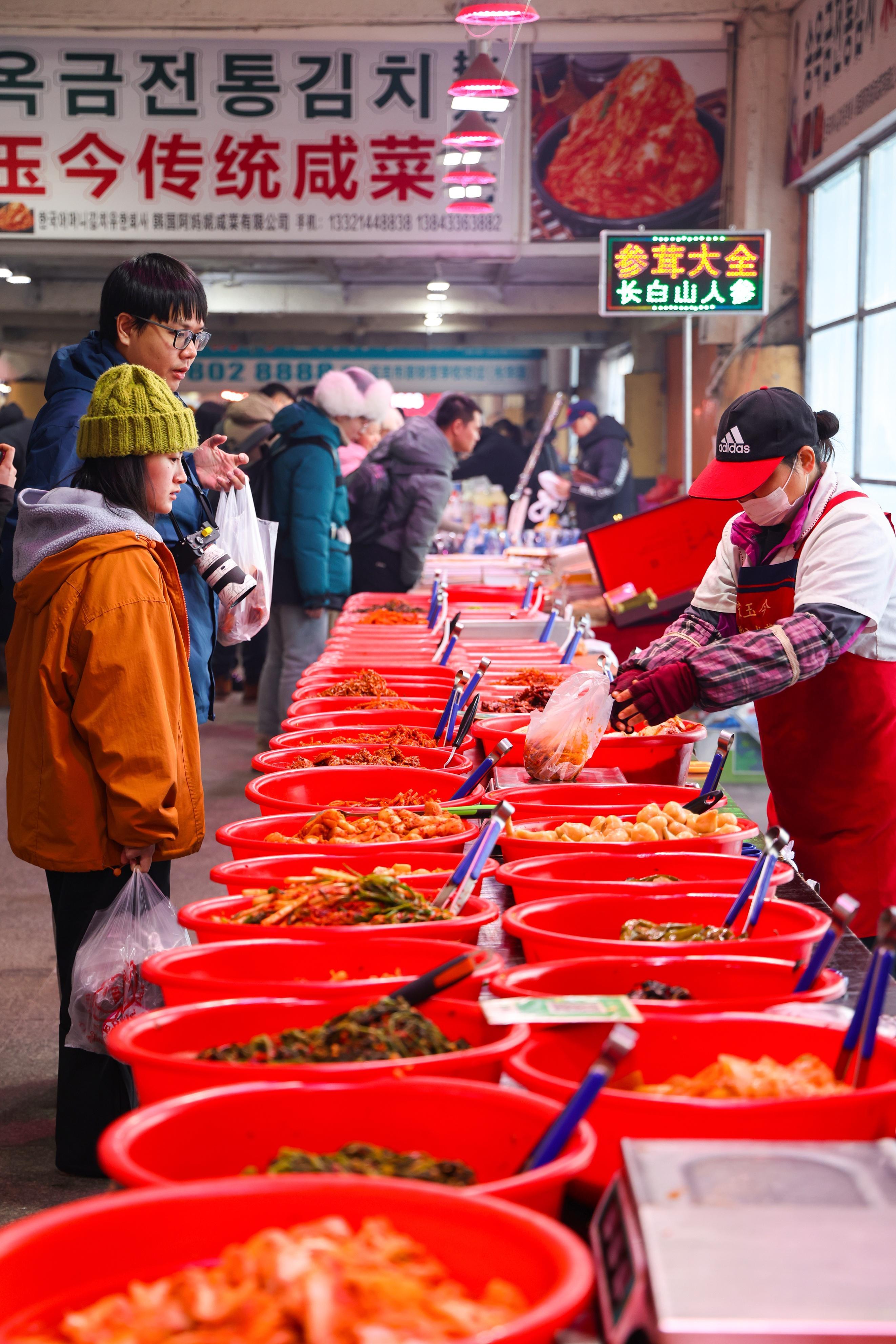 1月11日,遊客在延吉東方水上市場內購買朝鮮族特色泡菜。記者 曹雪文 攝