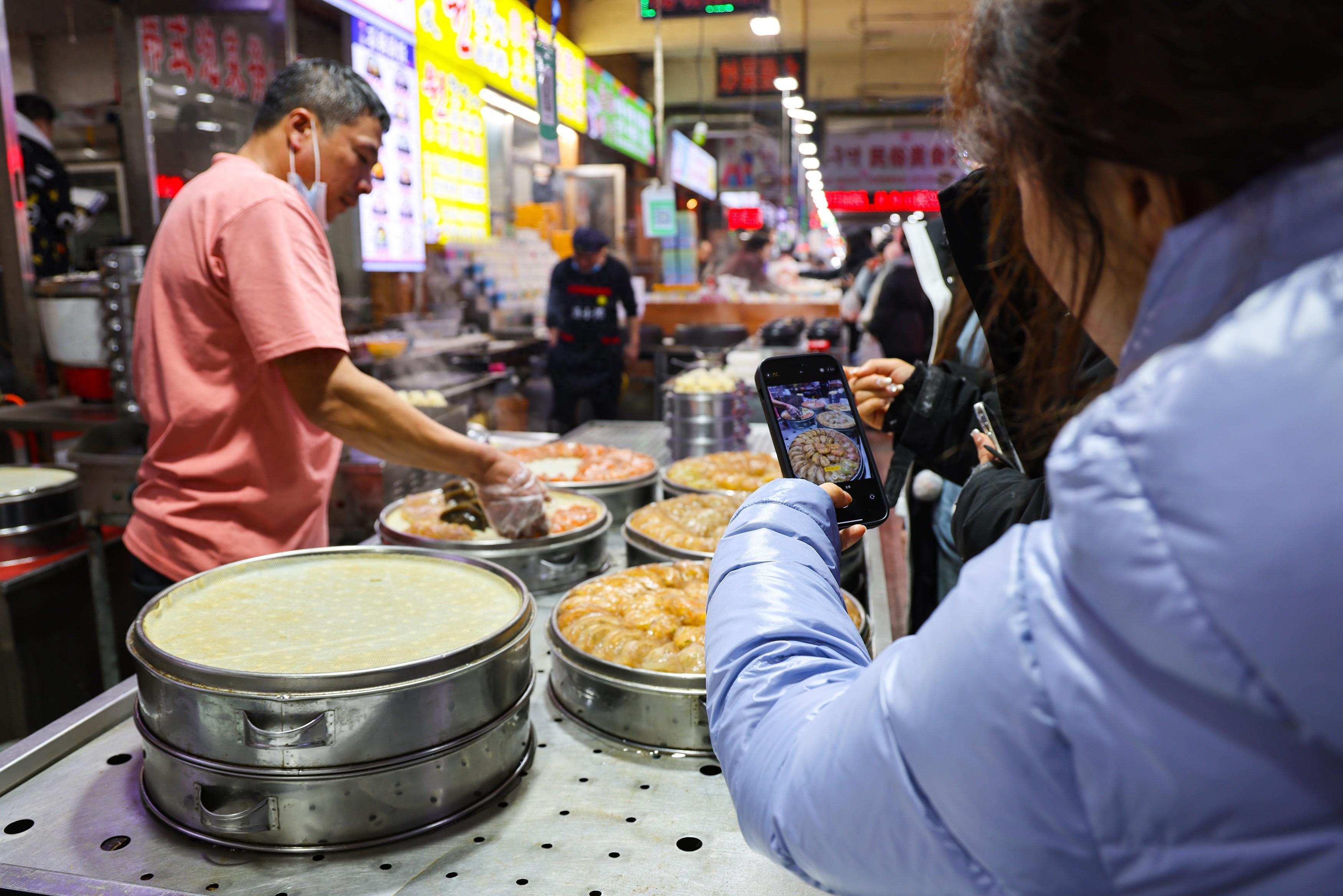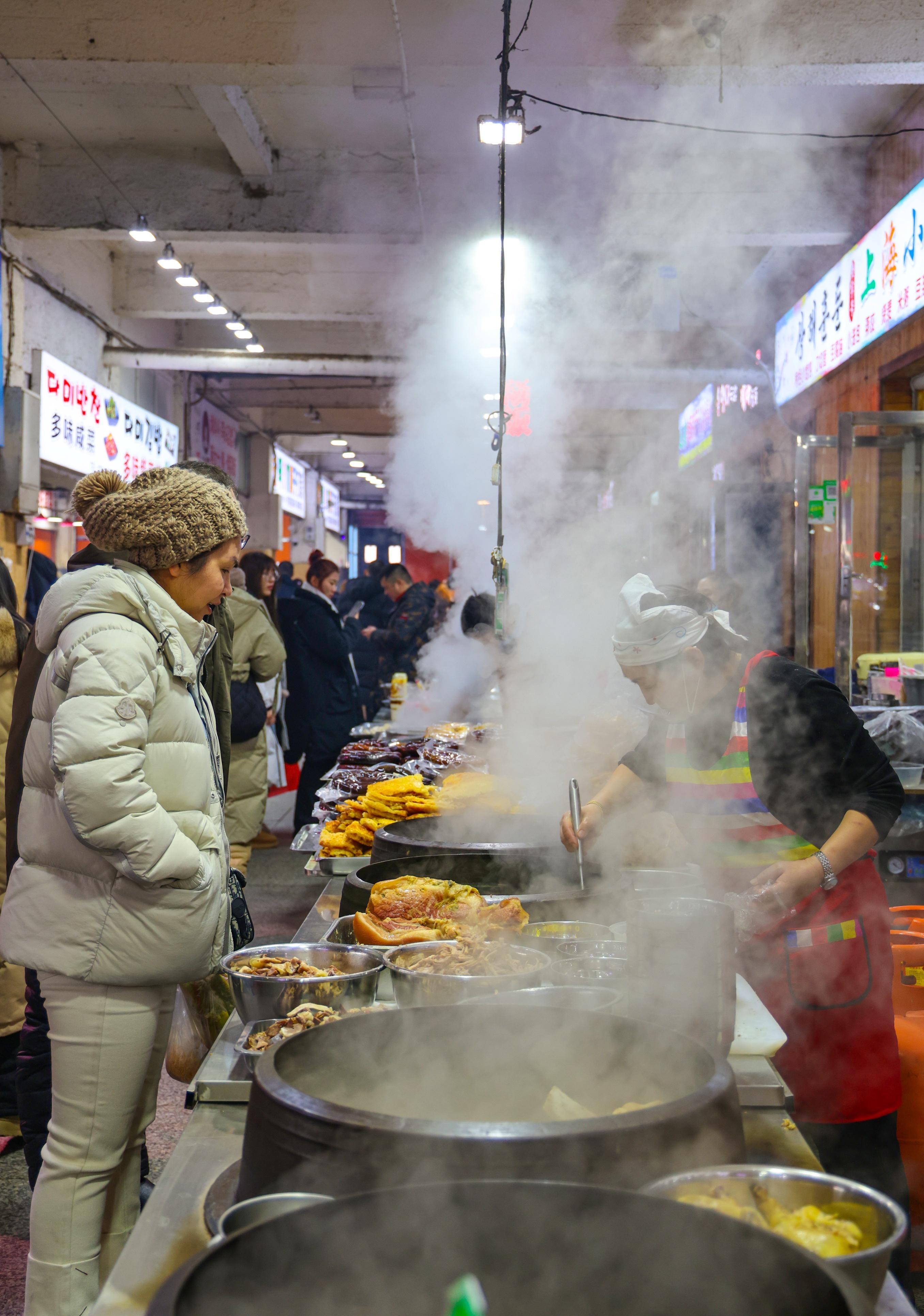 1月11日,延吉東方水上市場內人頭攢動,一位遊客在早餐鋪子前購買小喫。記者 曹雪文 攝