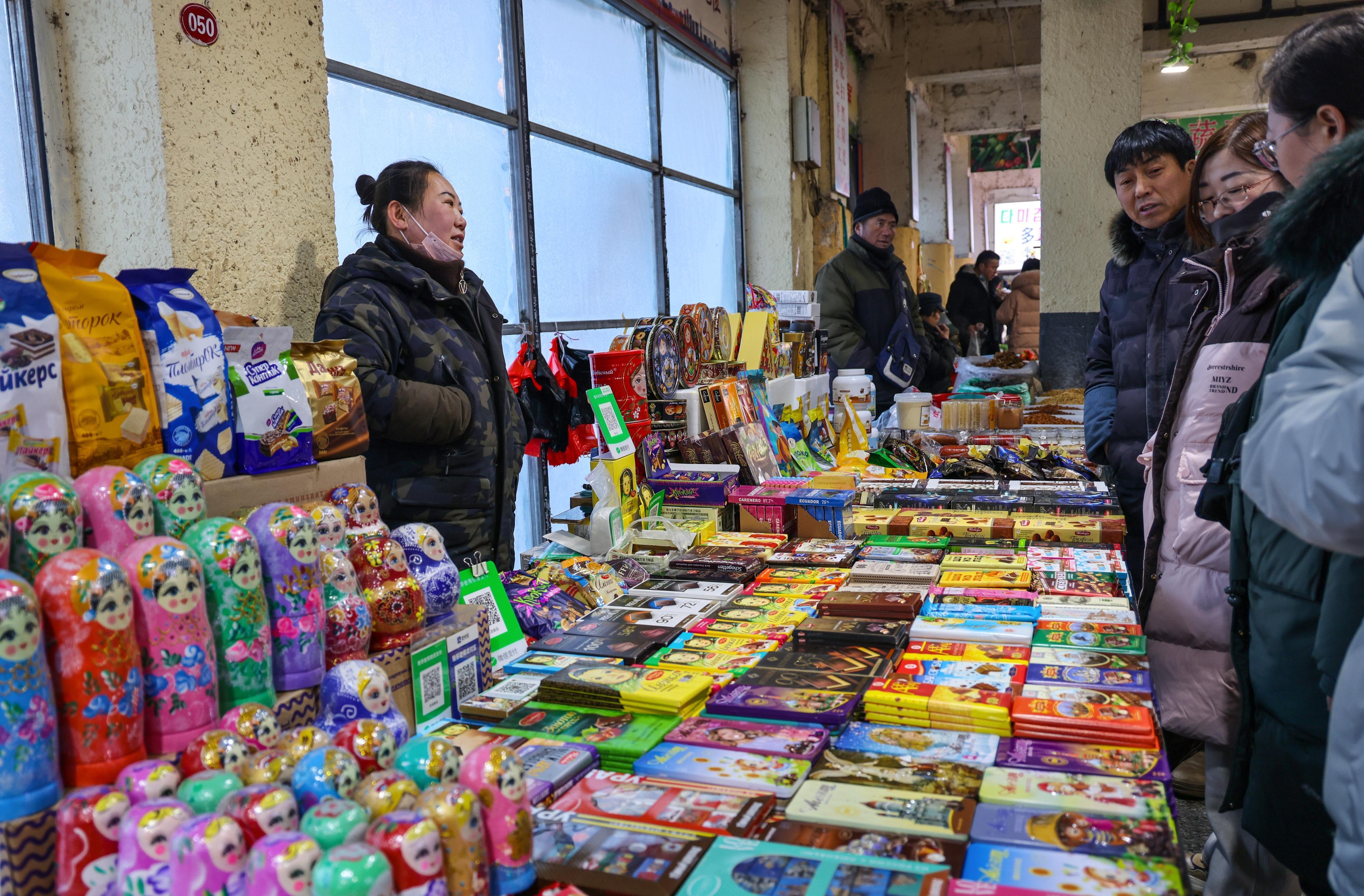 1月12日6時左右,延吉東方水上市場內的俄貨攤位前,遊客正在挑選特色產品。記者 曹雪文 攝