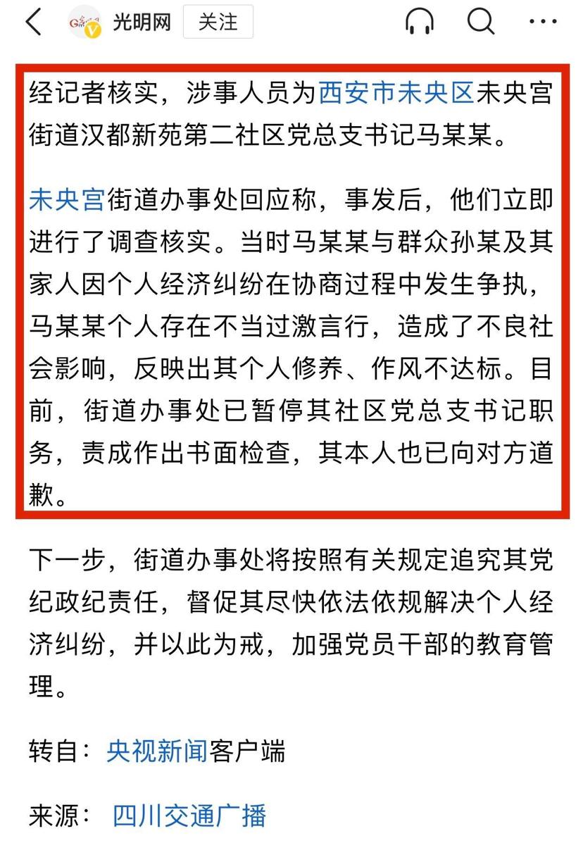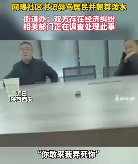 社區書記是羣衆的父母官,然而近日陝西西安未央區未央宮街道漢都新苑第二社區黨總支書記馬某某與羣衆私人經濟發生糾紛,不但口出狂言威脅羣衆,一怒之下將桌上水直接潑向對方,這樣行爲怎麼能勝任父母官呢?