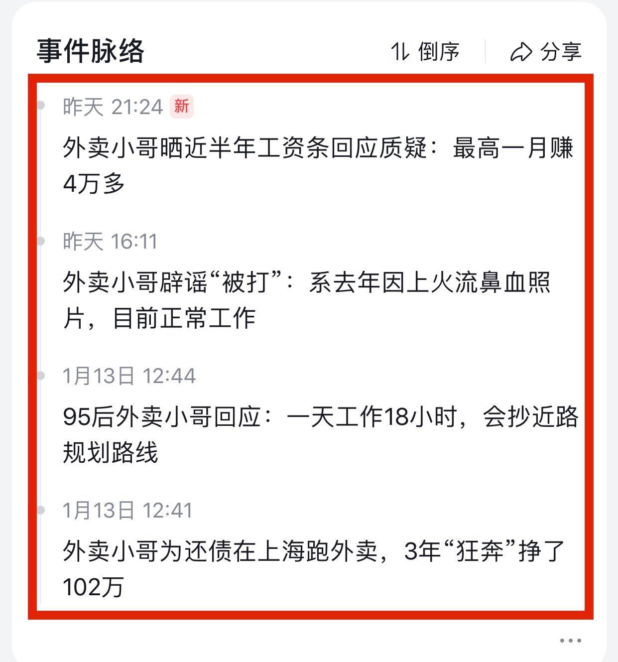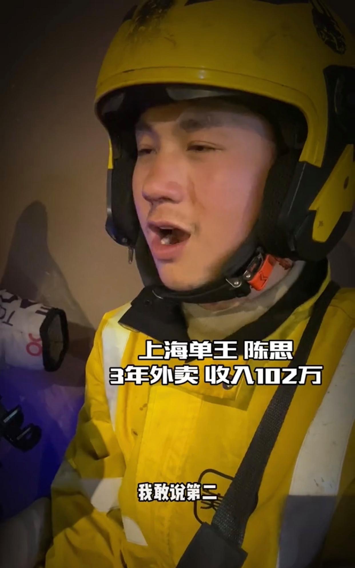 事情得從陳思最近熱搜說起,原因是他在2024年1月1日起宣佈要開始分享自己送外賣的經歷,教新手進入外賣行業如何快速賺錢,少走彎路,目前陳思某音賬號分享不到10個視頻,粉絲不到2萬,他上熱搜原因是自己抖出來的,他宣稱自己在上海跑了3年外賣,在上海22萬名騎手中,連續3年霸榜第一名,他說在上海送外賣,我陳思敢說第二沒有人敢說第一,他說三年來起早貪黑每天只睡4小時,單日最高紀錄180單,最多一個月能達到達到4031單,工資最高一個月達到6萬多,三年累計117368單,三年下來總共賺了102萬元,平均一年賺34萬元,每個月平均工資2.8萬元多。