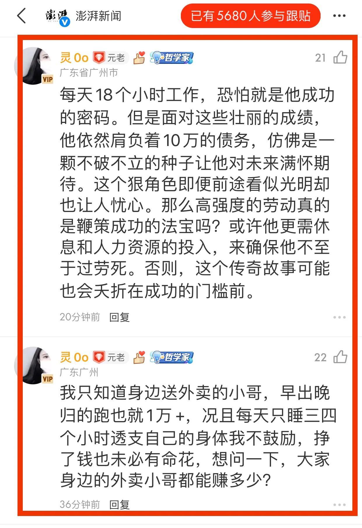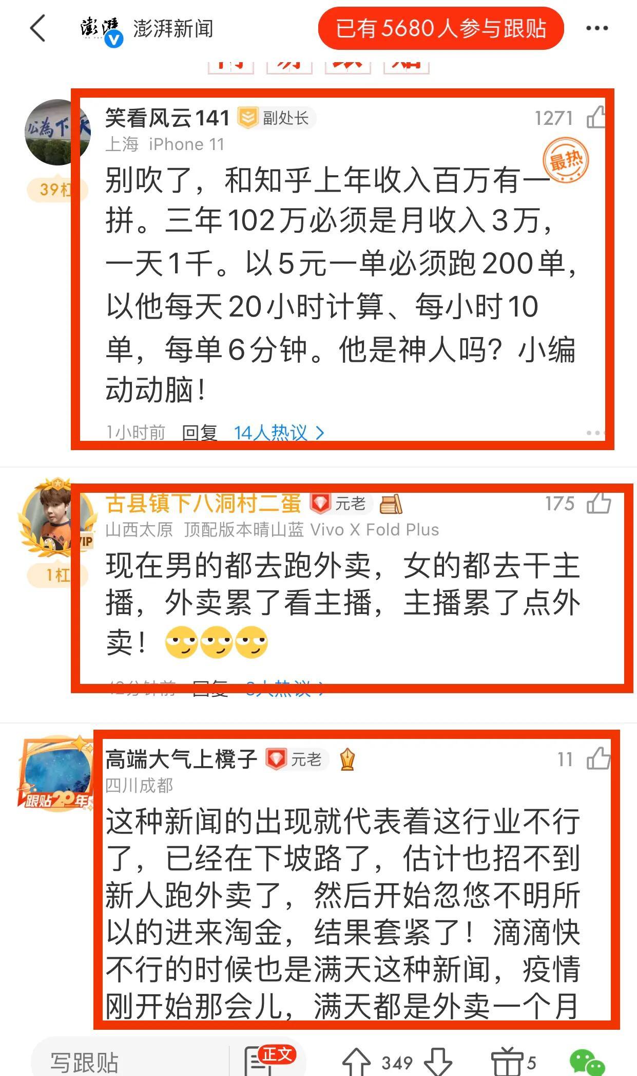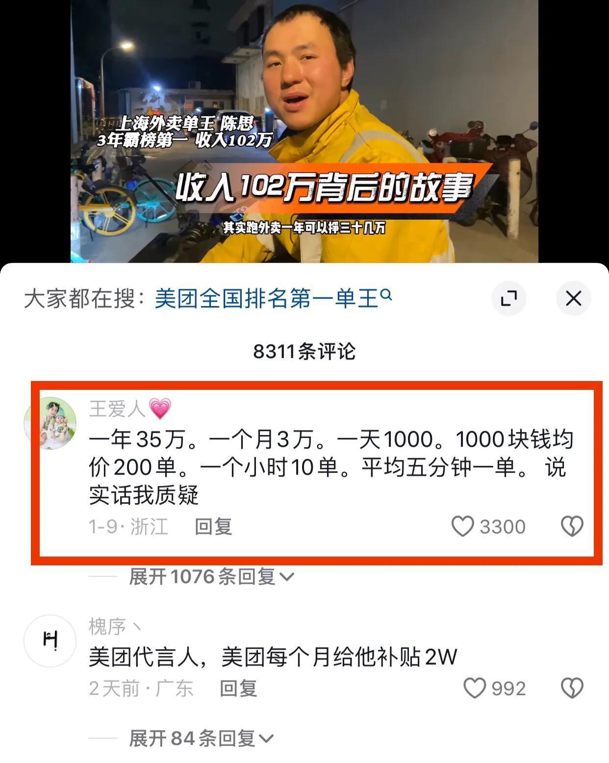 1、網友@王愛人說: 一年35萬。一個月3萬。一天1000。1000塊錢均價200單。一個小時10單。平均五分鐘一單。 說實話我質疑