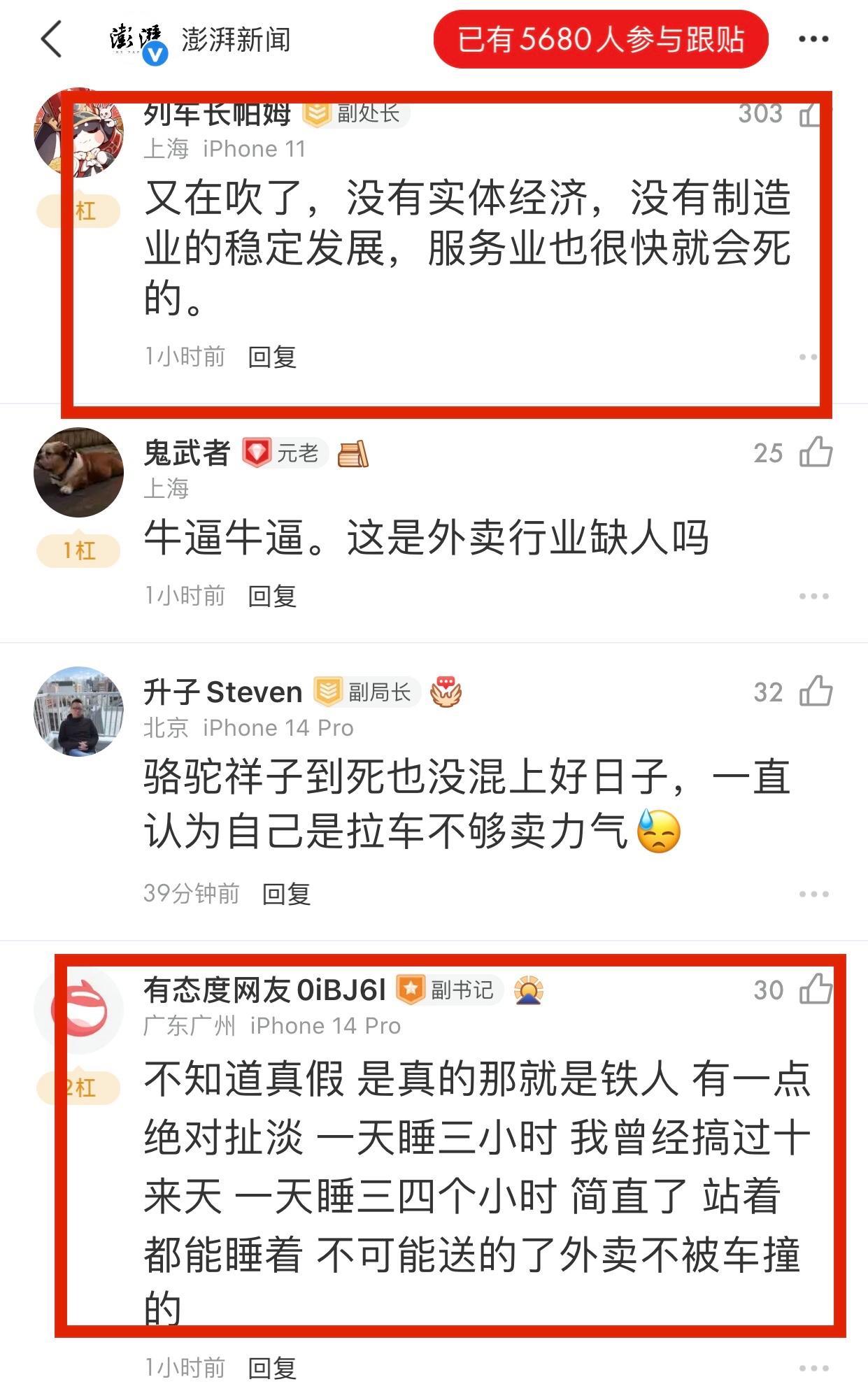 3、網友@露露吖說: 上海單王陳思,很有名的,而且他能掙一百萬,是比正常外賣員付出了更多的時間,幾乎沒有自己的休閒時間的,我感覺全中國的外賣員也找不出幾個“陳思”。正常地區的外賣員一個月5-6千差不多了,而且外賣這個行業巨榨乾身體的。