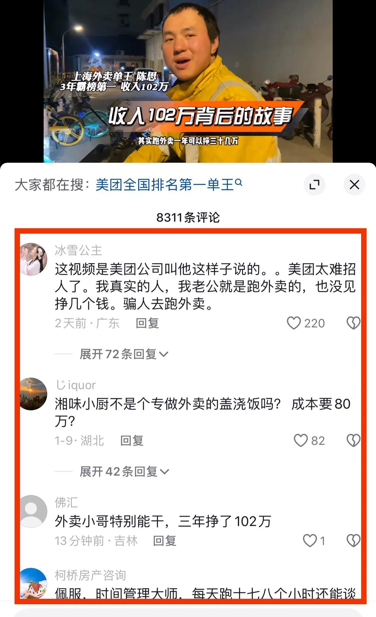 下面摘取網上各大報道外賣小哥新聞網友留言,我看了基本懷疑他炒作,3年賺102萬還是很大一筆天文數字,但是也有個別奇蹟發生。