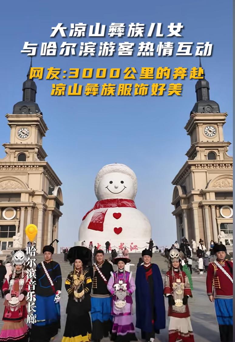 4.四川大涼山彝族兒女在哈爾濱索菲亞教堂、哈爾濱音樂長廊等與遊客互動,爲哈爾濱助力加油。