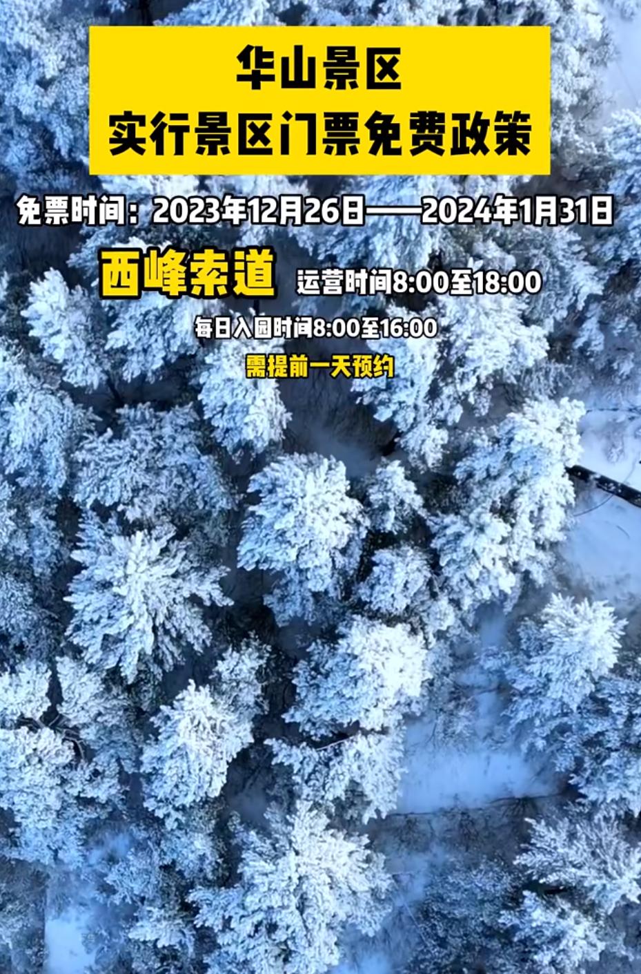 華山景區自2023年12月26日至2024年1月31日,面向全國遊客實行華山門票免費措施(不含進山車票與索道票)。