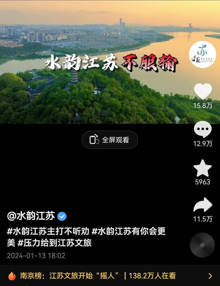 網友喊話江蘇文旅“催更”,“優等生”隨即跟上,江蘇文旅一段原創“喊麥”道出心聲,“水韻江蘇”主打不聽勸,“我姓蘇,大江蘇,水韻江蘇不服輸,功名深藏我必護;我姓蘇,大江蘇,大江大湖安康富庶繁華圖,船擼水鄉情愫美如初……”