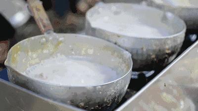“毋”通“無”,毋米粥有“有米不見米,只取米精華”之意。粥如其名,熬煮毋米粥需至米粒熔化,無顆粒,化成牛奶色的湯水即成。